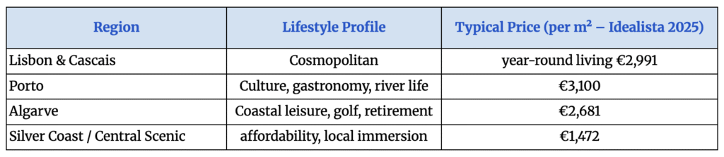 Foreign buyers accounted for about 5 % of all transactions in early 2025 (INE / Idealista). The UK, France, Germany, and the US lead the charge, joined by growing numbers from the UAE and Singapore. Key magnets include the Algarve, Lisbon, Porto, and the Silver Coast — each appealing to a slightly different lifestyle buyer: