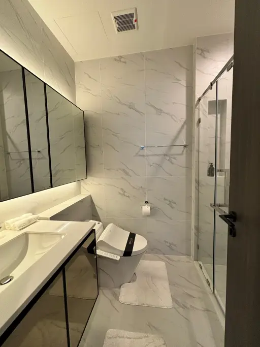 This 35 sqm condo in Khlong Tan Nuea is a neat, well-thought-out space with everything you need for comfortable city living. The queen-sized bed faces large floor-to-ceiling windows, so you’ll get plenty of natural light and a nice view of the Bangkok skyline – perfect if you like starting your day feeling connected to the city.