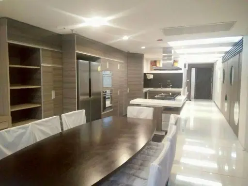 The open-plan layout flows seamlessly from the living area into the dining and kitchen space. The dining table seats eight comfortably, so it’s great if you like having friends or family over. You’ll notice the modern, wood-finished kitchen is super practical, stocked with built-in appliances including a double oven and microwave, plus a stainless steel refrigerator. Cooking at the kitchen island with a cooktop and range hood feels really sleek, surrounded by clean white surfaces and under-cabinet lighting that keeps the whole space bright.