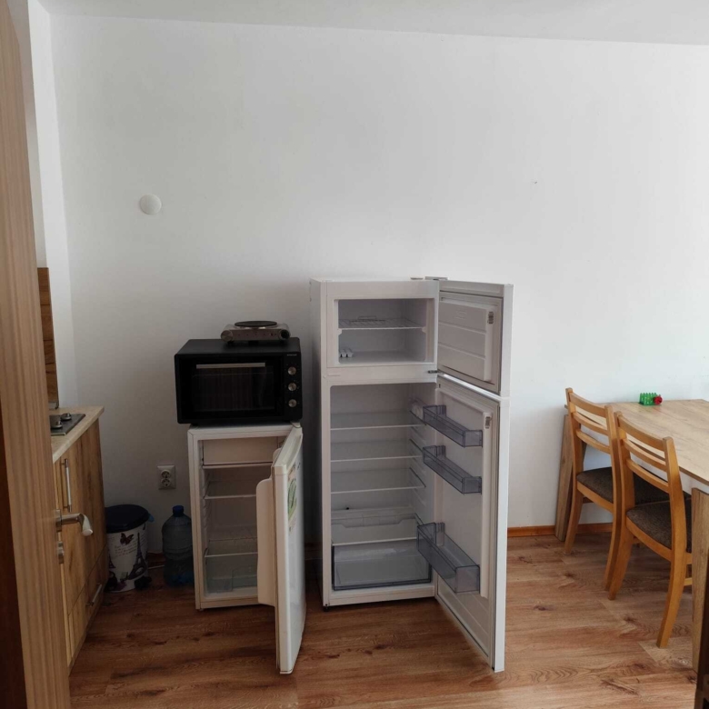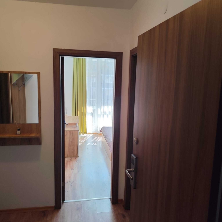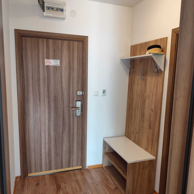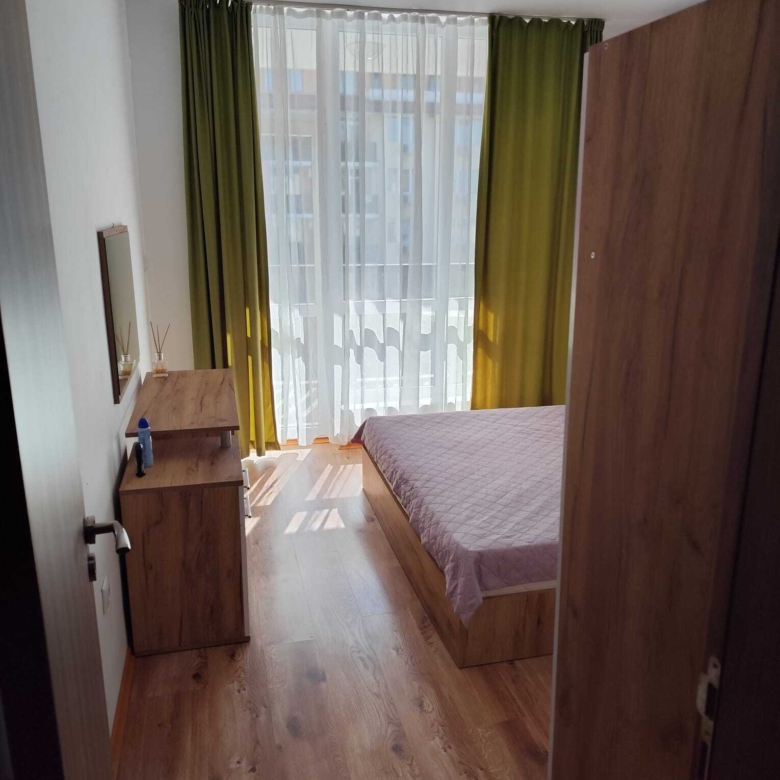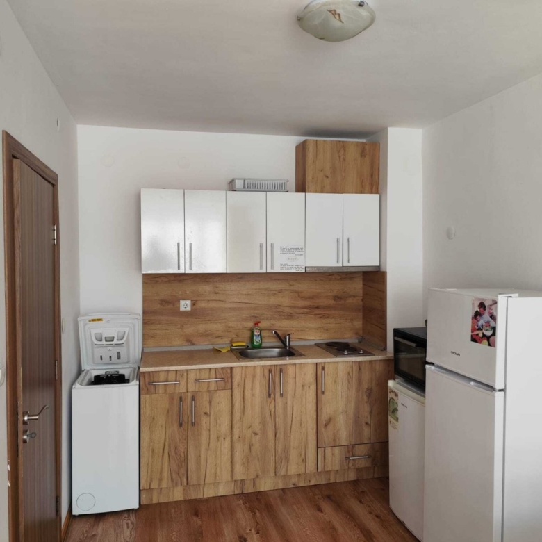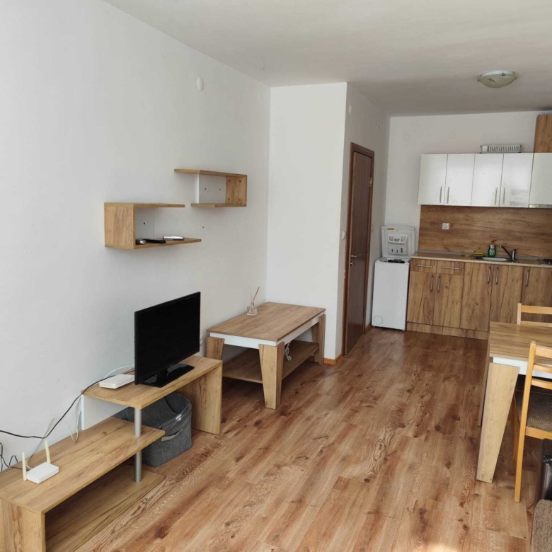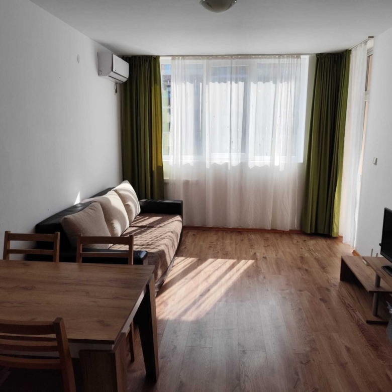 We offer you a 2-room apartment on the 4th floor with an elevator in Chateau Aheloy 2 in Aheloy, Bulgaria. The total area is 65 square meters and is divided as follows: an entrance area with a wardrobe, a living room with a sofa, coffee table, TV stand, shelf, dining table, chairs, and an integrated kitchen with a cooking hob, extractor fan, microwave, sink, and refrigerator. The bedroom has a double bed, wardrobe, air conditioning, nightstands, lamp, and access to the balcony with side sea view. The bathroom is designed as a shower room.