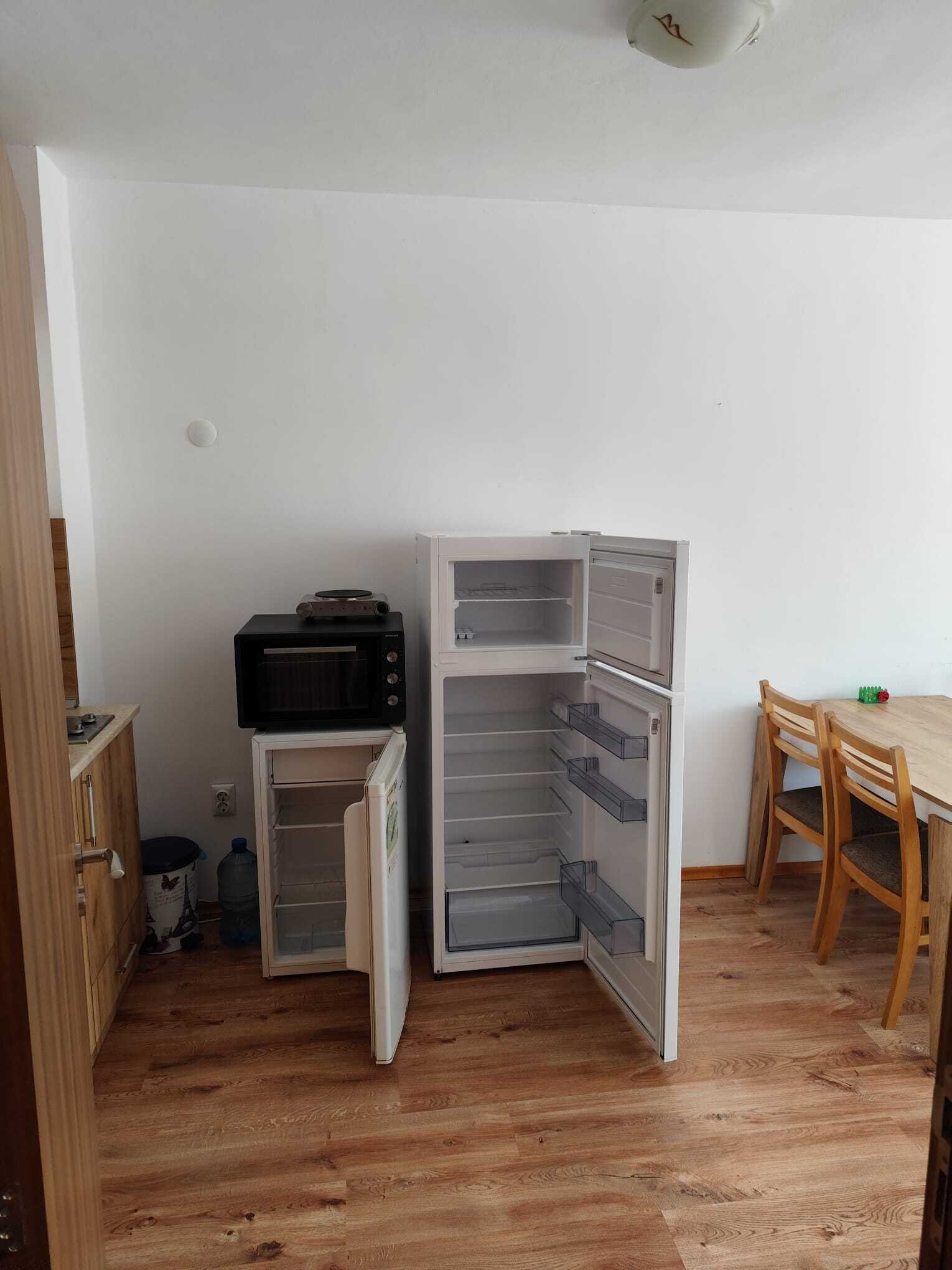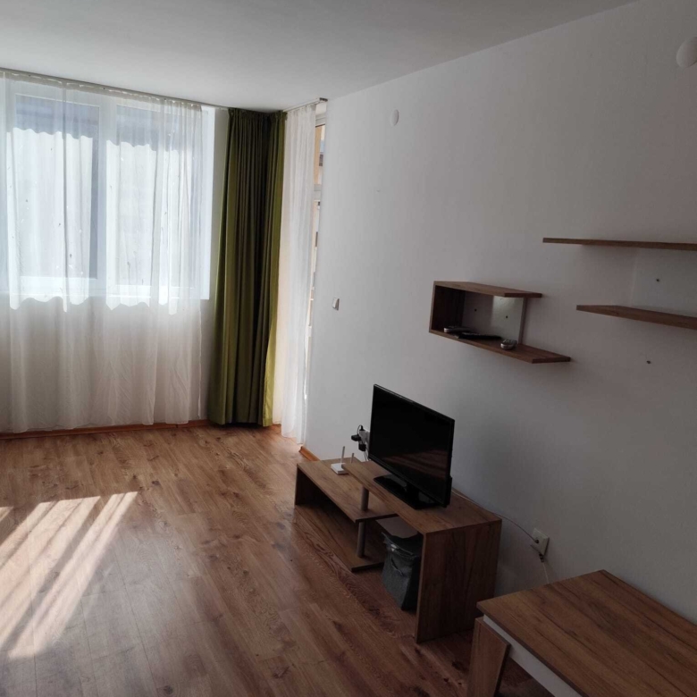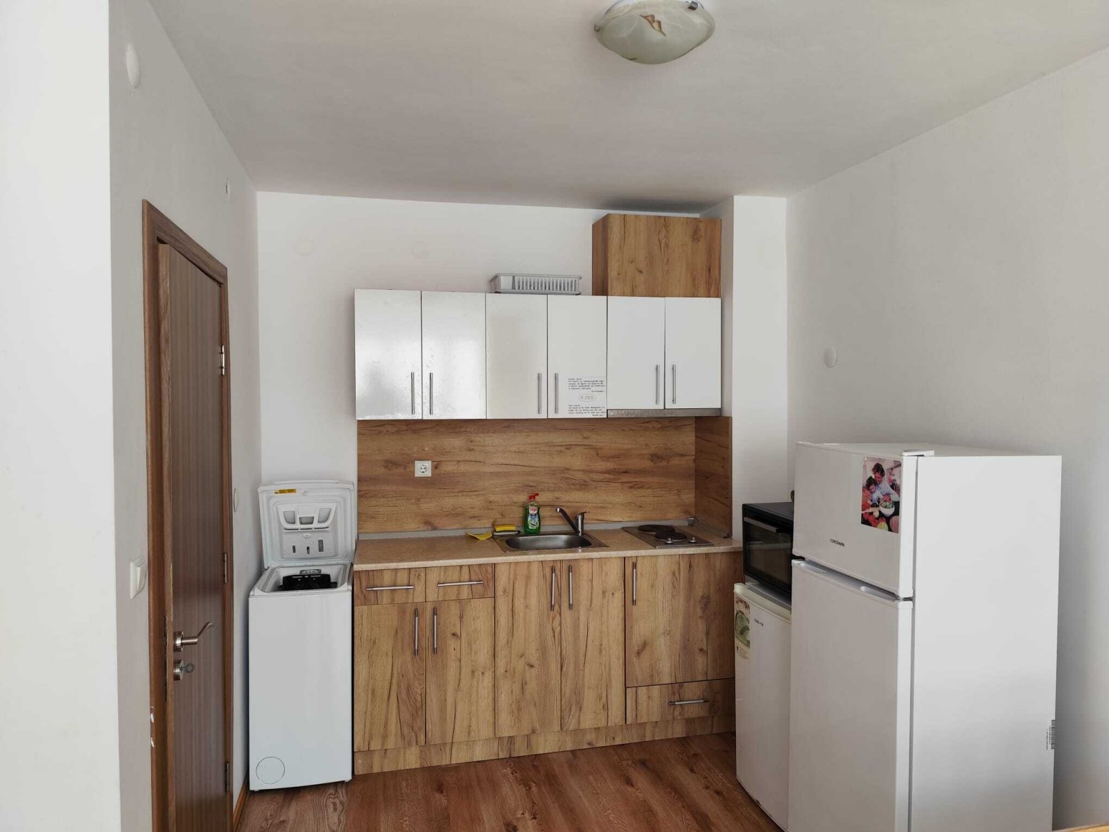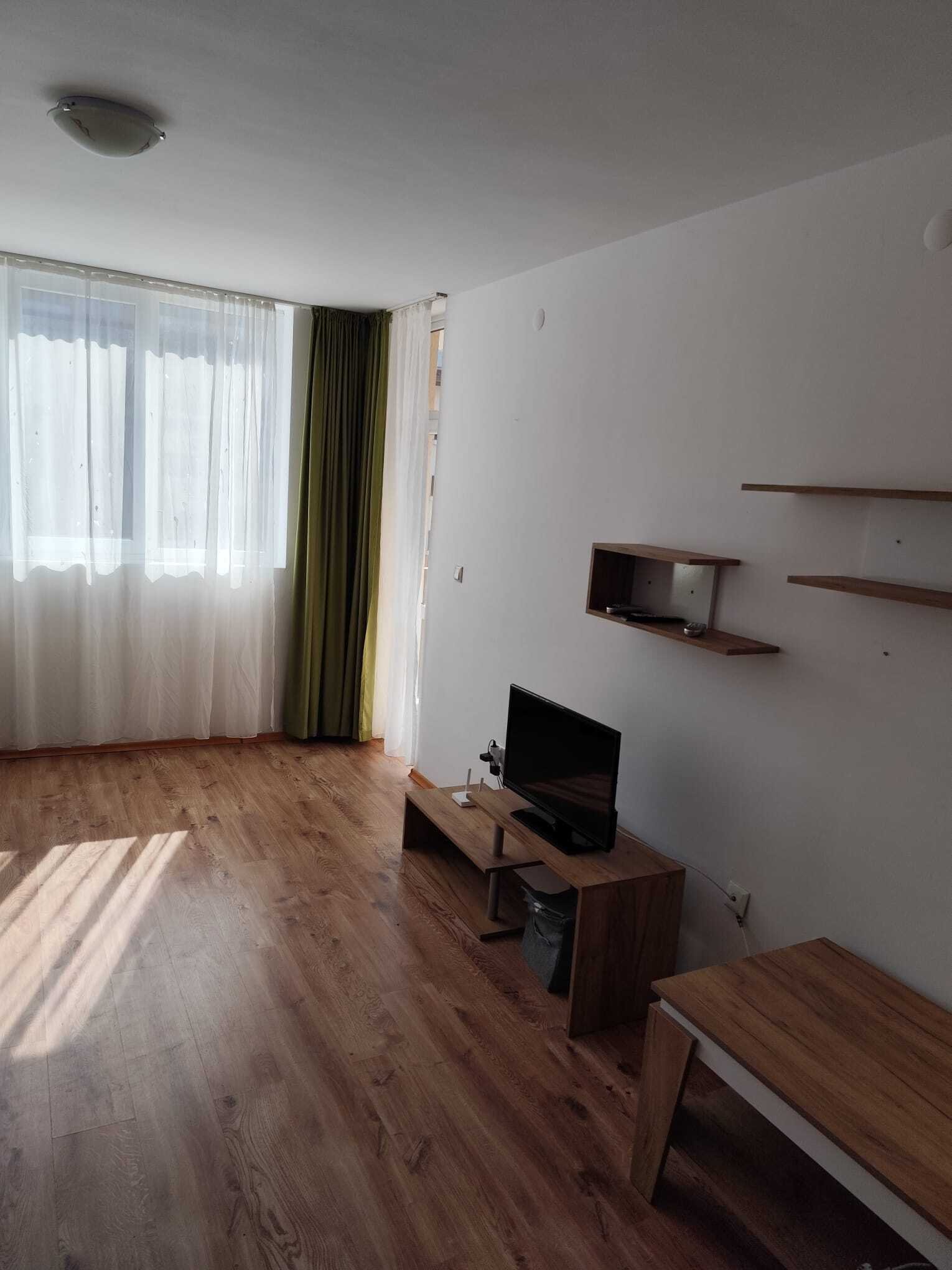 We offer you a 2-room apartment on the 4th floor with an elevator in Chateau Aheloy 2 in Aheloy, Bulgaria. The total area is 65 square meters and is divided as follows: an entrance area with a wardrobe, a living room with a sofa, coffee table, TV stand, shelf, dining table, chairs, and an integrated kitchen with a cooking hob, extractor fan, microwave, sink, and refrigerator. The bedroom has a double bed, wardrobe, air conditioning, nightstands, lamp, and access to the balcony with side sea view. The bathroom is designed as a shower room.
