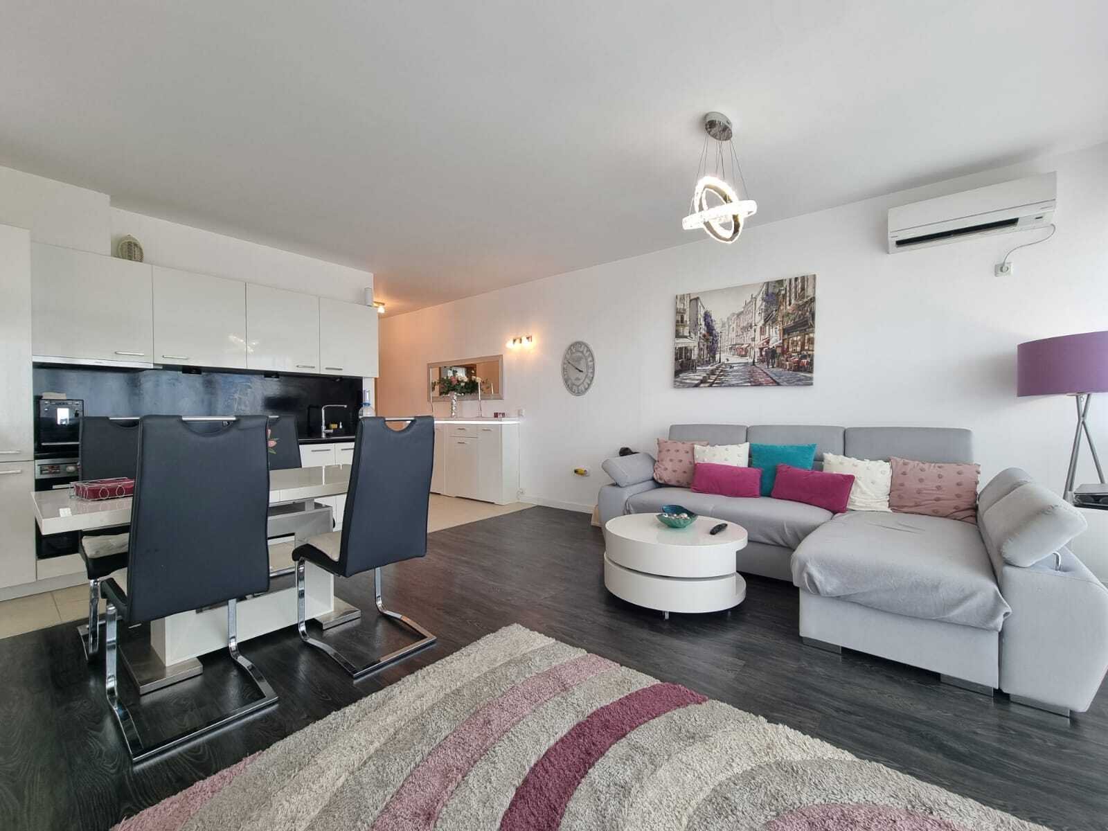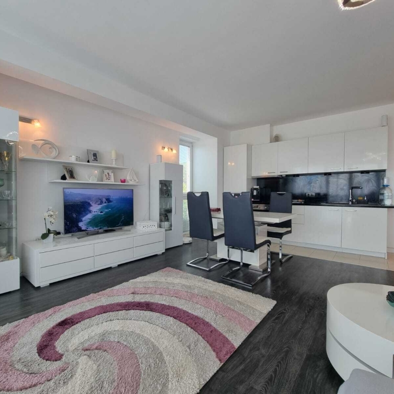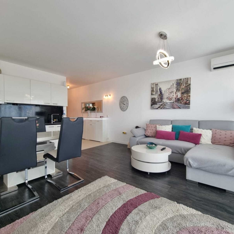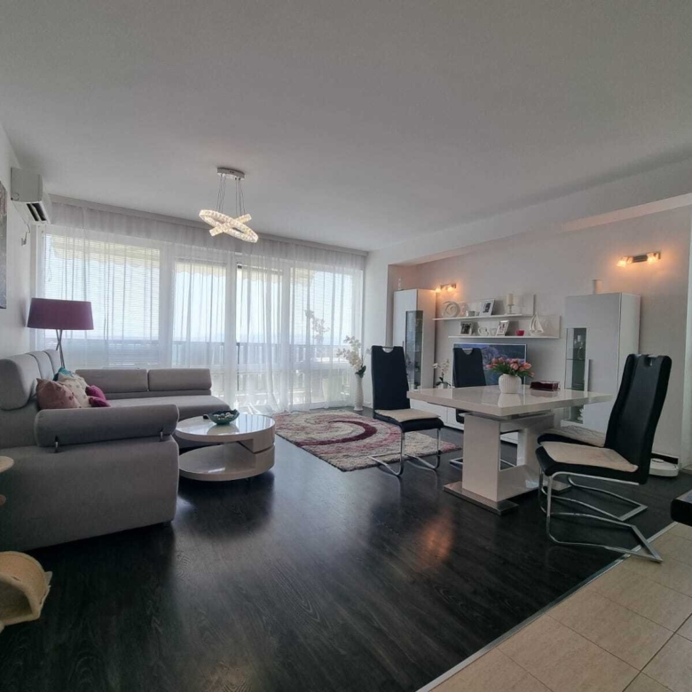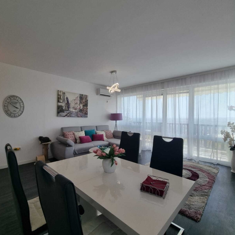 Bright, sunlit living room with seating area, TV, dining table, and a fully equipped kitchenette. Access to the main balcony with wonderful views of the sea and Sunny Beach.