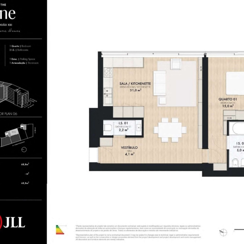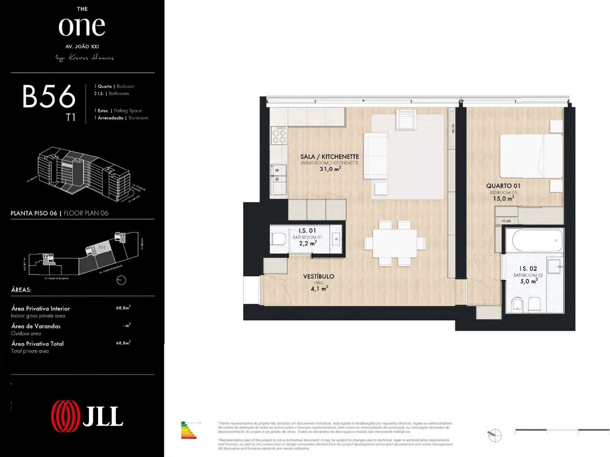 1-bedroom flat with 69 sqm of gross private area, in new condition, located on the 6th floor of The One building, designed by architect Eduardo Souto de Moura, situated on Avenida João XXI, in Lisbon. Includes one parking space and a storage room.The social area comprises a living room and kitchen in open-plan layout with 31 m². The private area includes an en-suite bedroom with full bathroom and a guest toilet. The orientation towards the interior of the block ensures tranquillity, openness, and good sun exposure.The flat is equipped with air conditioning via fan coil units in all rooms, hot water system supported by solar panels and heat pump, and home automation system. The finishes include multi-layered oak wood flooring, marble in the bathrooms, underfloor heating in the en-suite bathroom, electric blinds, and a fitted kitchen with Bosch appliances. The parking space has infrastructure for electric vehicle charging.The building offers residents an equipped gymnasium (Technogym) and communal garden. Designed by architect Eduardo Souto de Moura, 2011 Pritzker Prize winner, the project stands out for its contemporary and functional language, attention to detail, and harmonious integration between interior and exterior spaces.Located in one of Lisbon’s most central areas, the flat is within walking distance of Campo Pequeno, Avenida da República, Culturgest, Praça de Londres, and Jardim do Arco do Cego. It is also close to Escola Dona Filipa de Lencastre and various public transport options, including underground and train services (Campo Pequeno and Entrecampos). Lisbon Airport is approximately 15 minutes away.