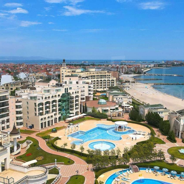 We offer you an exclusive 2-room apartment in the renowned Sunset Resort in Pomorie – only 20 meters from the beach.