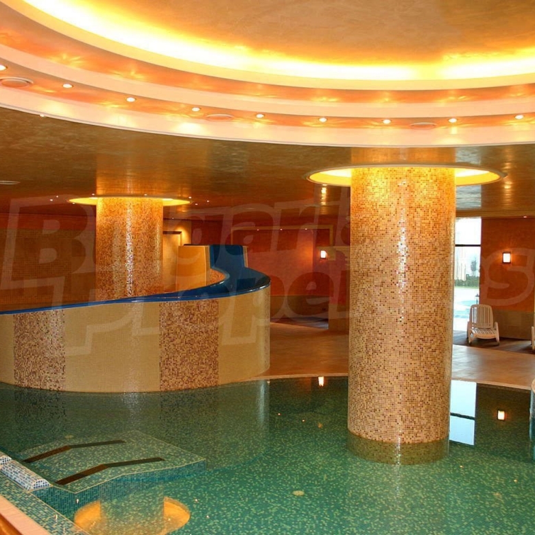 Within the complex’s territory, there are 4 swimming pools with children’s entertainment, such as: a water park and various water attractions, a river-shaped swimming pool, a sunbathing and relaxation area—all spread over an area of 3,500 square meters. The complex features 9 restaurants offering different cuisines: Italian, Bulgarian, Asian, French, seafood, and grill restaurant—appealing even to the most finicky guests. The grounds of the complex are lushly landscaped, with walkways, fountains, relaxation spots, flowerbeds with exotic plants, and nighttime lighting that create a comfortable and inviting atmosphere. The stylish spa center is located in a building called Sigma. On-site facilities for guests and owners include an indoor pool, Turkish bath, Finnish sauna, steam room, whirlpool, beauty salon, and various types of massages. For sports enthusiasts, there are numerous services: a fitness room, water aerobics, and aerobics classes. For children, there are various entertainment programs as well as a babysitting room. The complex also has several conference halls, one designed for 472 people. It features a medical clinic, bowling alley, bars, shops, currency exchange office, internet room, open parking lots, and an underground garage. The wide range of services and entertainment options at Sunset Resort makes it unique and unparalleled. The beach is only 20 meters away—a broad strip of sand with clear sea water—perfect for a wonderful holiday. Opposite the complex is one of the largest water parks called “Sunset Aquapark Pomorie.” Supermarkets, pharmacies, grocery stores, and all city infrastructure are within walking distance. A vast amount of greenery, sea breeze, crystal-clear air—all these will be offered by Sunset Resort.