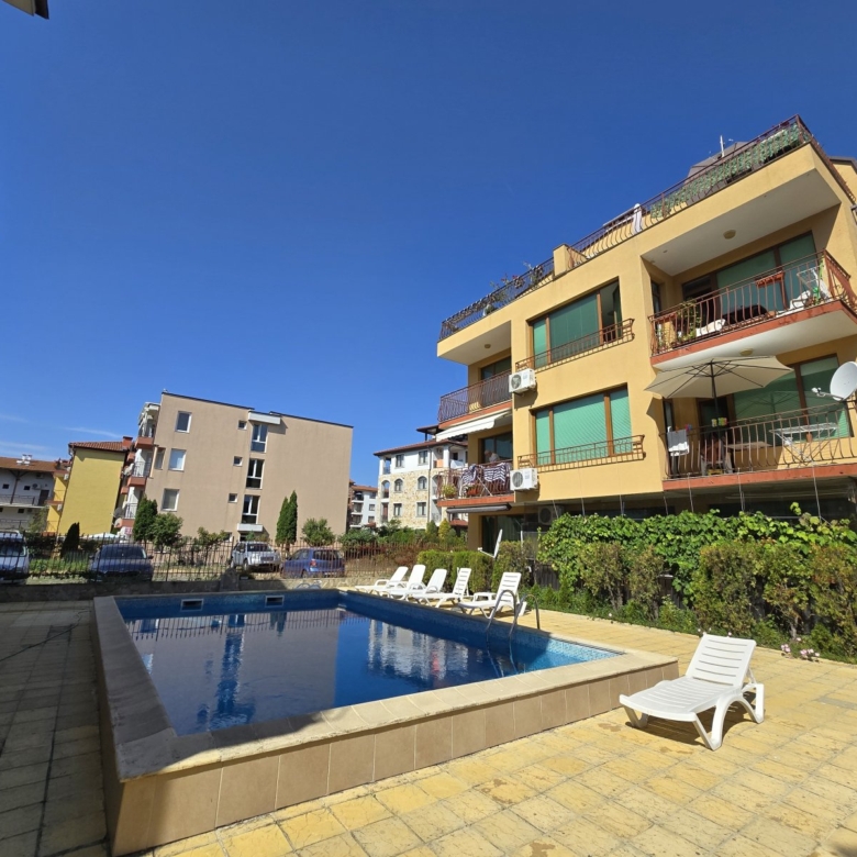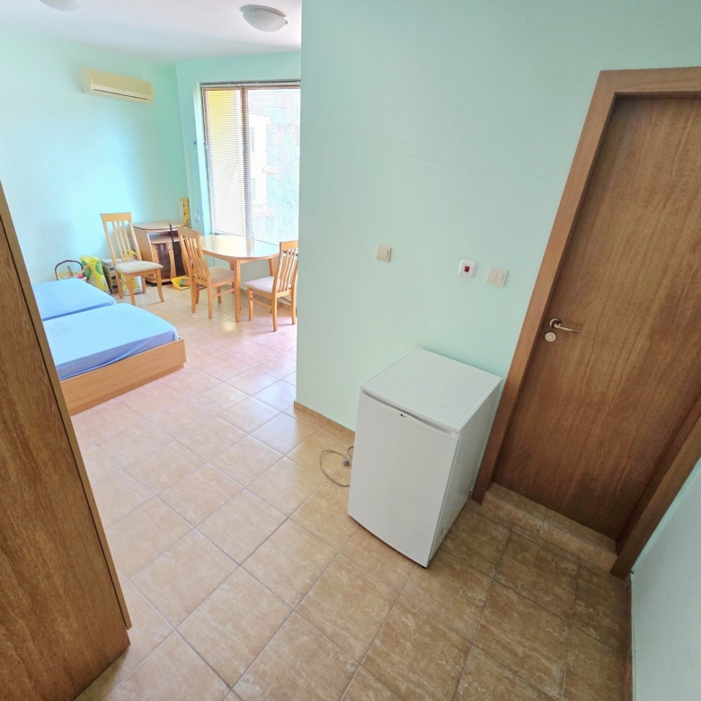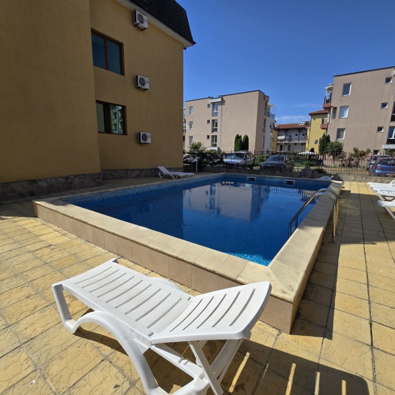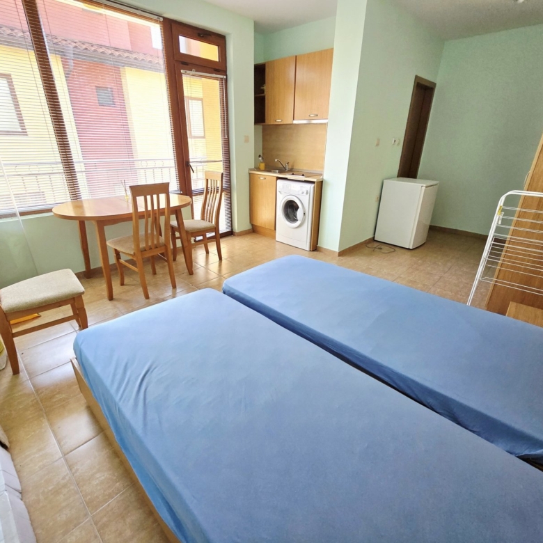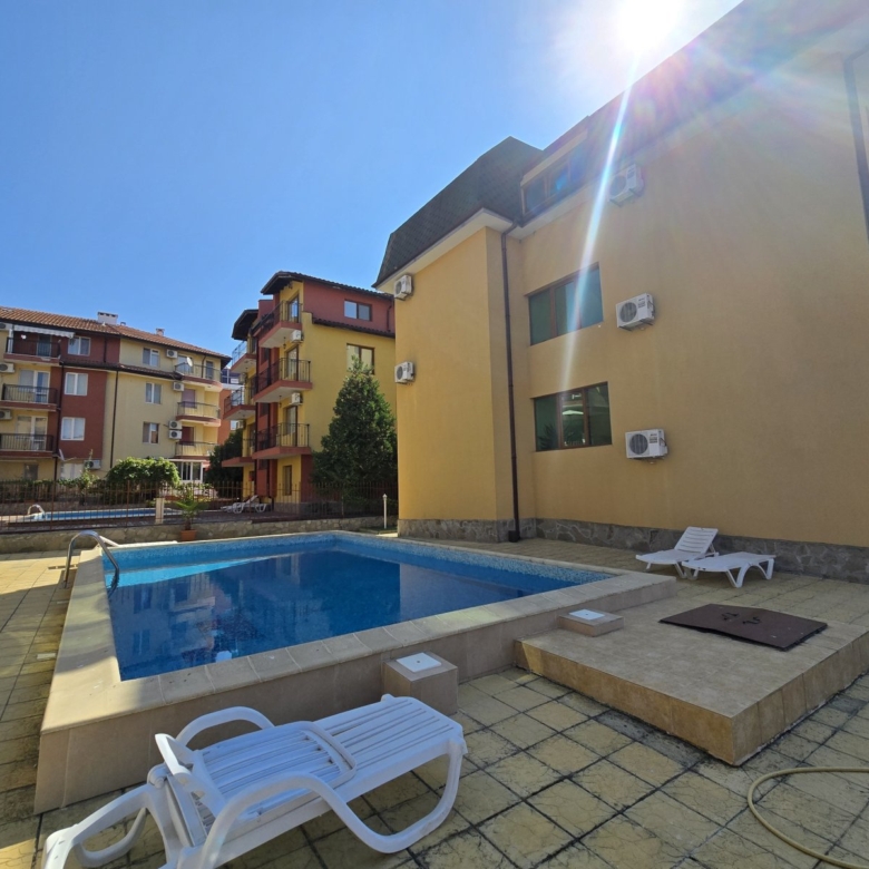 We offer you a well-maintained studio apartment in the Amoto Complex in Ravda. The apartment is located on the 2nd floor (out of a total of 3 floors) and impresses with its practical layout, fully furnished interior, and a balcony with a slight view of the pool.