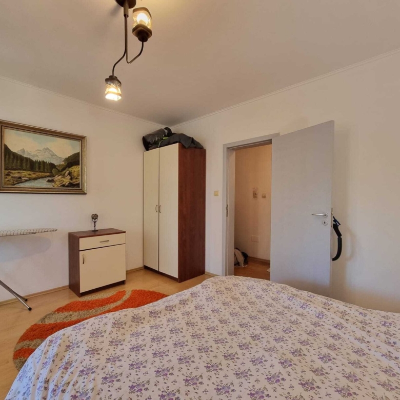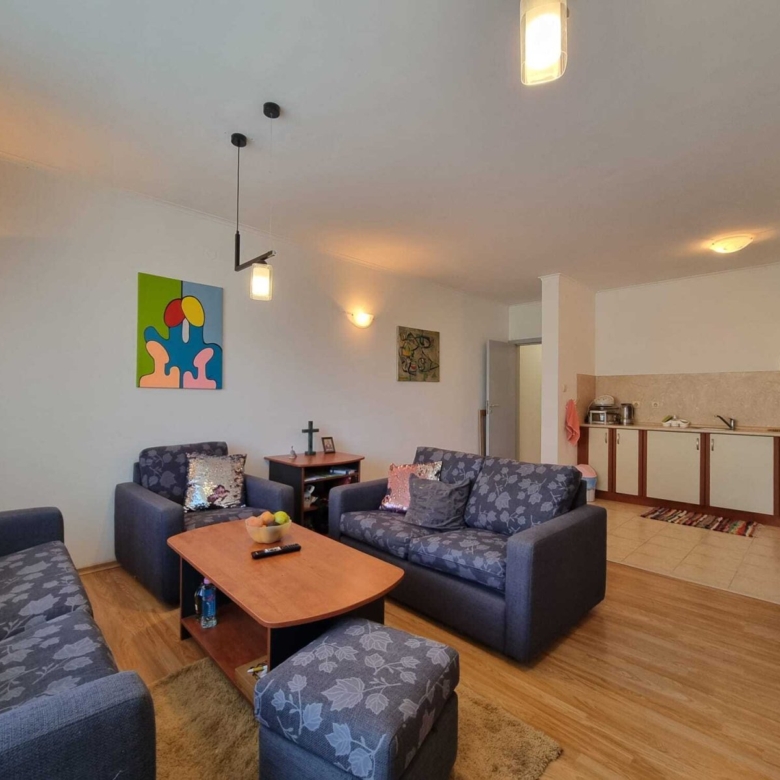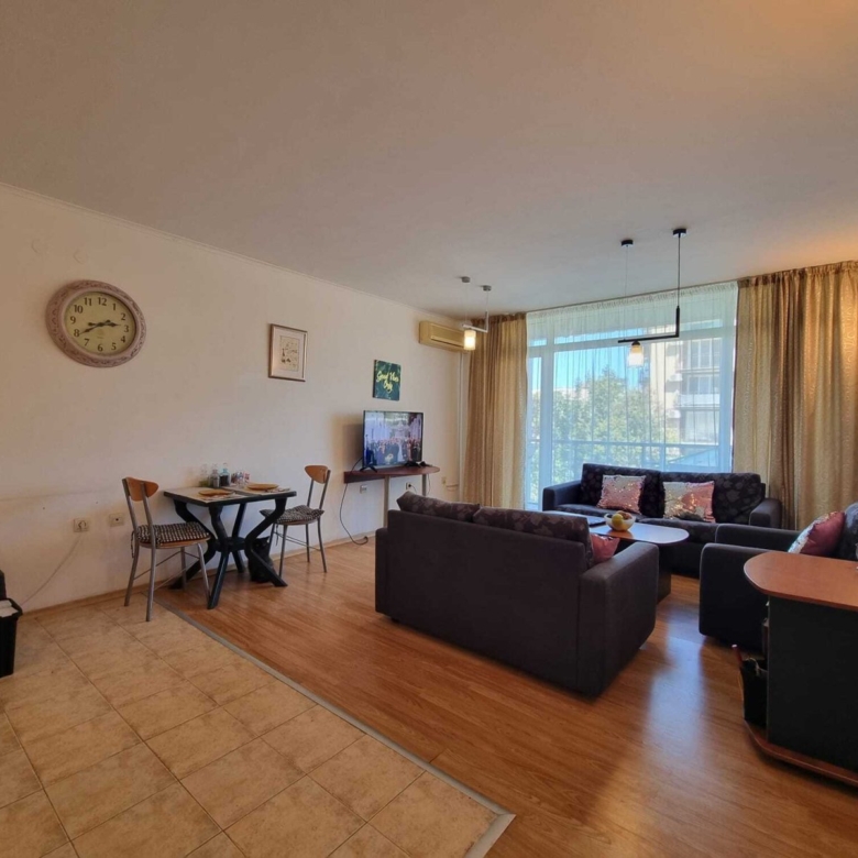 We offer you a 2-room apartment in the Prima 1 complex at Sunny Beach, Bulgaria. The entrance area features a wardrobe. The living room with integrated kitchen includes: