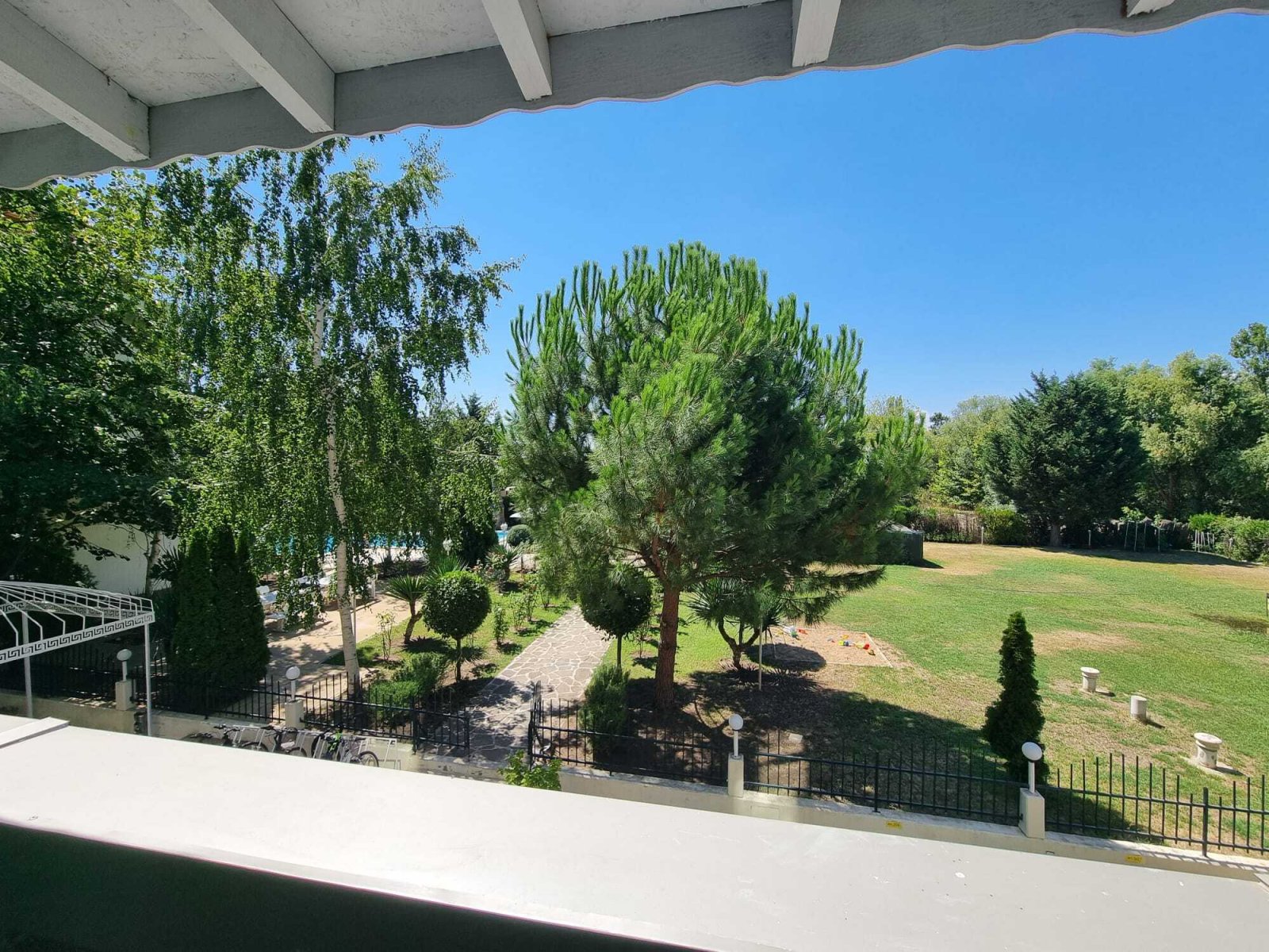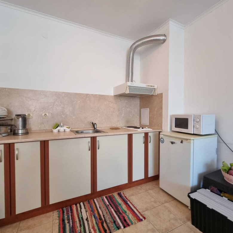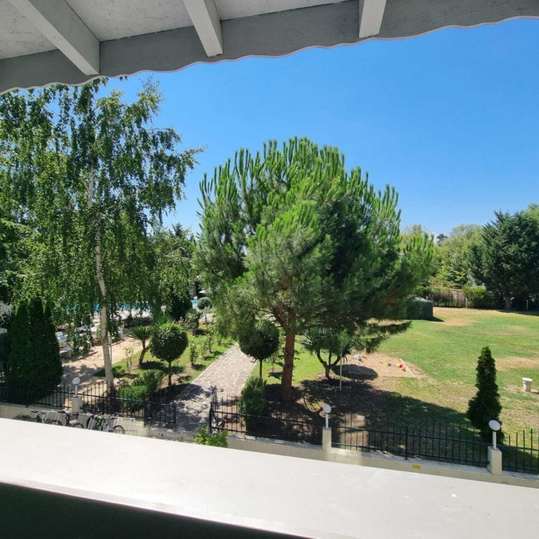 The apartment has a total area of 96 sq. m, is located on the second floor, and consists of: an entrance hall, a living room with a kitchenette and dining area, a bedroom, a bathroom with a shower, and two terraces overlooking the complex’s territory (one of which has seating). The apartment is furnished, equipped with appliances, and ready for occupancy or rental. The maintenance fee is 540 euros per year.