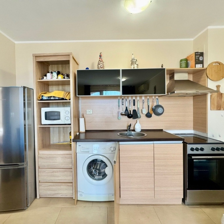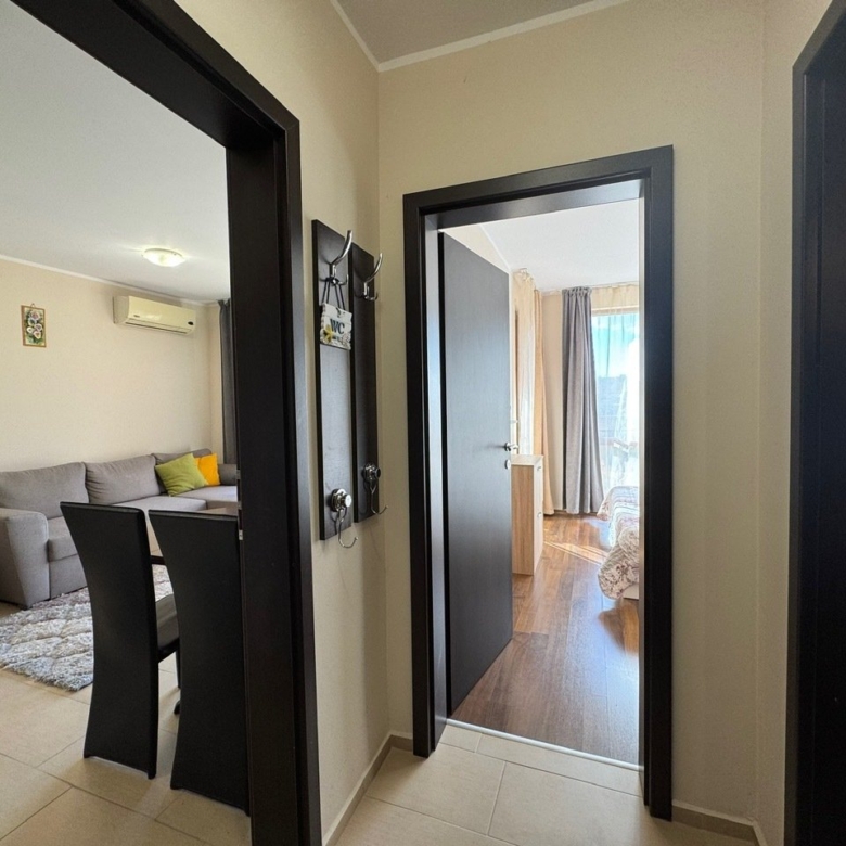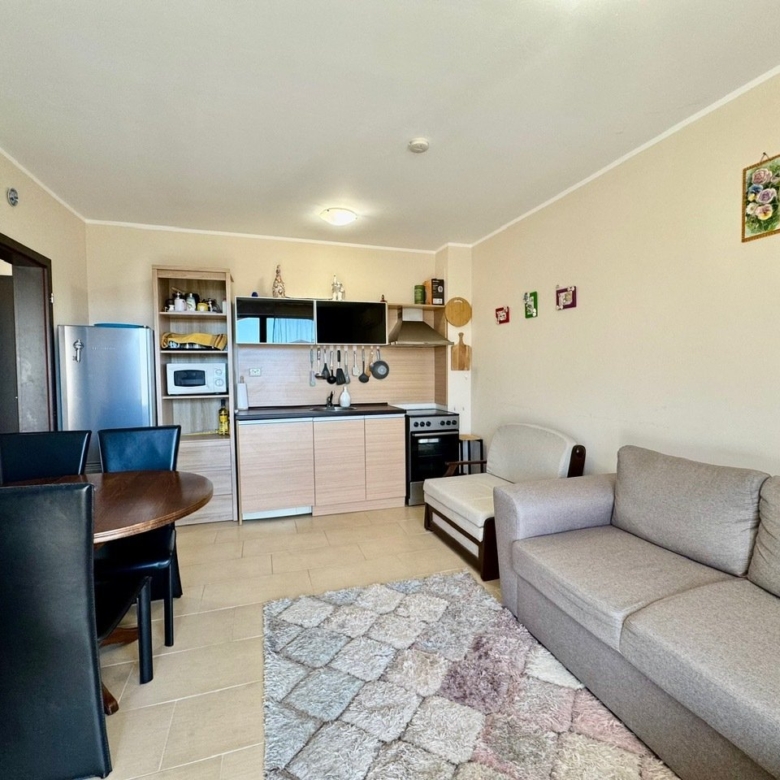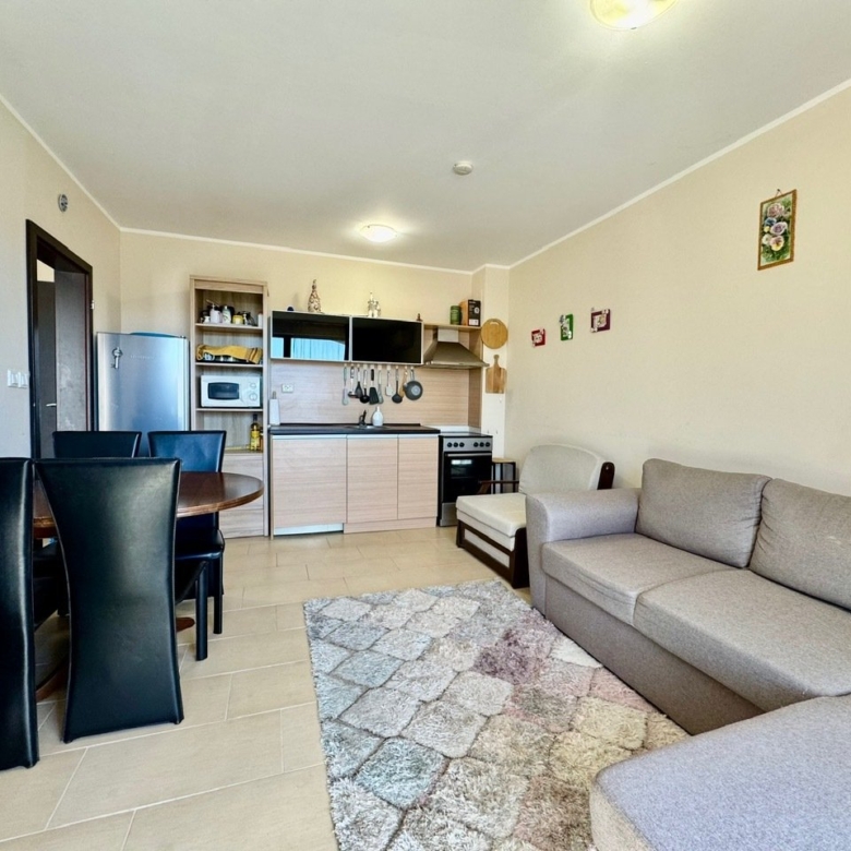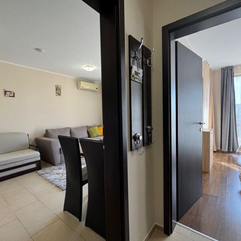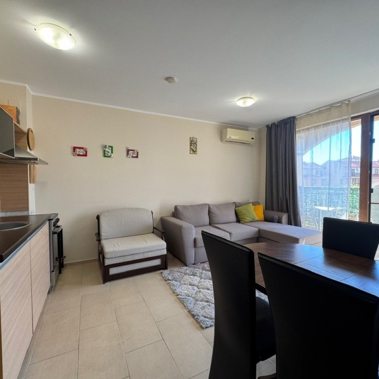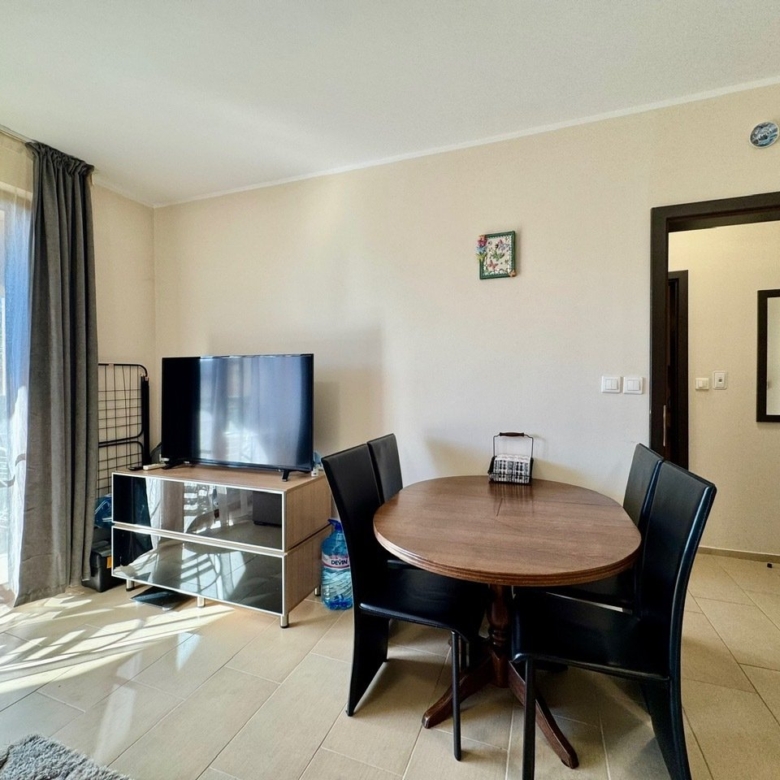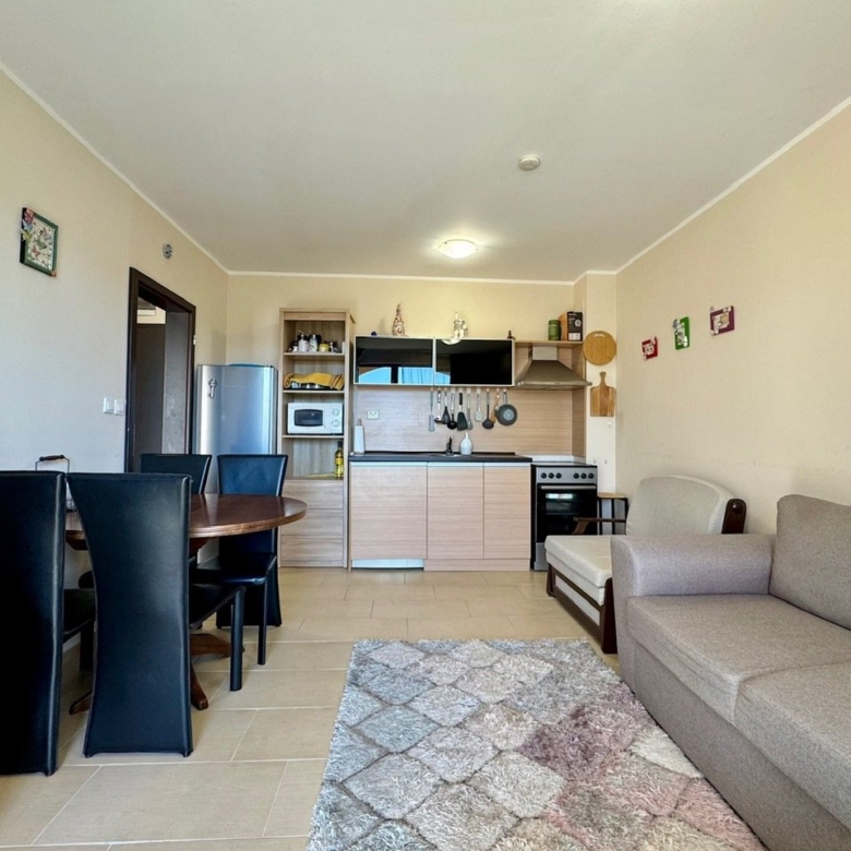 We offer for sale a 2-room apartment with a view of the pool. The apartment is located on the fifth floor and has a total area of 52 sqm. It consists of an entrance hall, a living room with a kitchenette and dining area, a bedroom, a bathroom with toilet, and a balcony. It is being sold fully furnished and equipped. The living room has an installed air conditioner. The balcony is furnished with garden furniture – perfect for enjoying the charm of spring and summer.