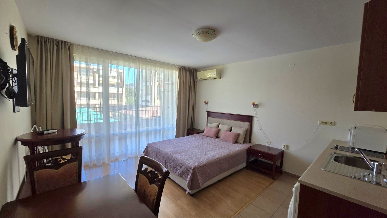 It is bright, comfortably furnished, and consists of a living/sleeping area with a kitchenette, a bathroom with a shower, and a balcony overlooking the complex.