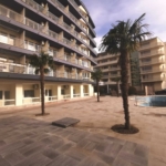 The apartment is situated in a well-maintained building with an elevator and has a living area of approximately 80 m². It consists of a bright living room with an integrated kitchenette, a separate bedroom, a bathroom with a shower, and a balcony overlooking the courtyard or pool area.
