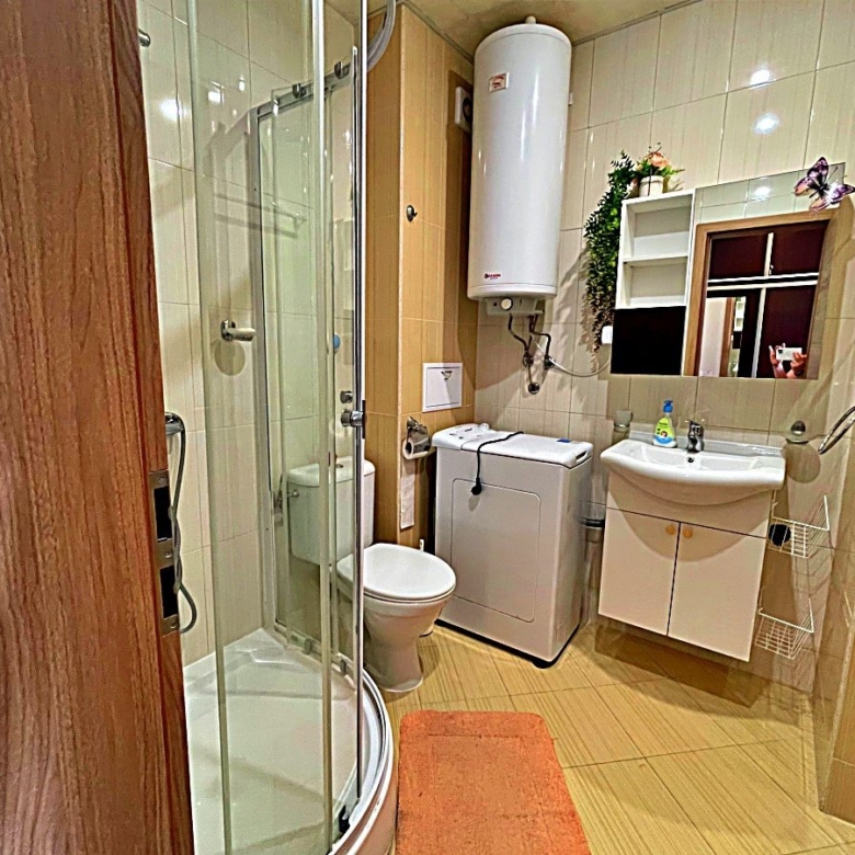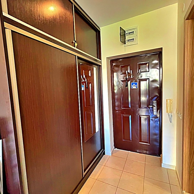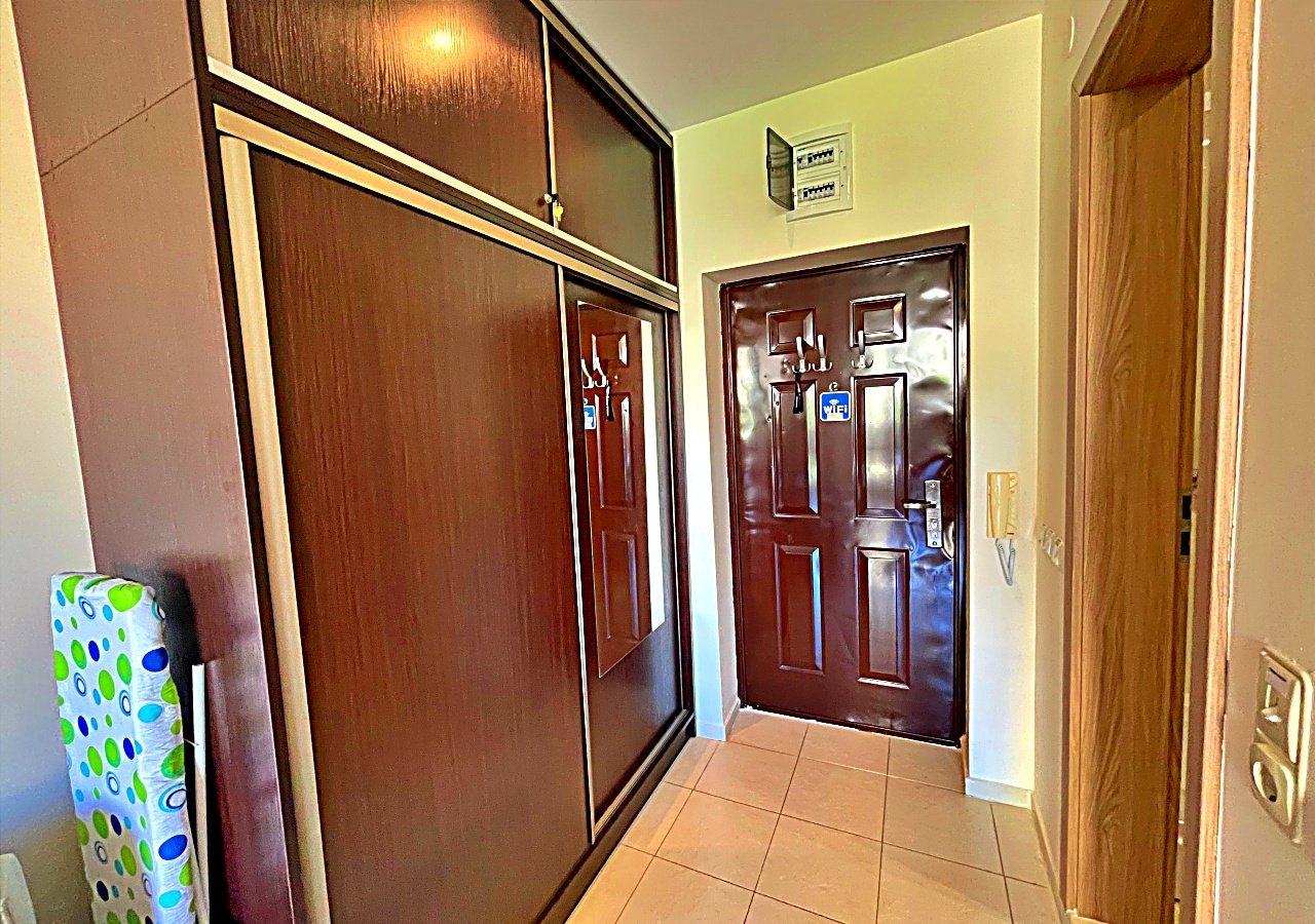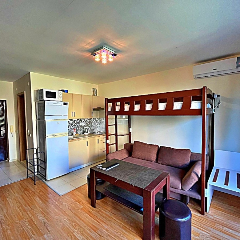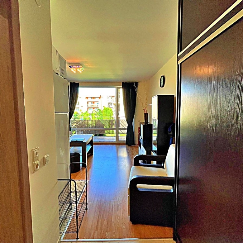 The studio offers a beautiful view of the garden and the pool from the balcony. It is equipped with a bed, a sofa, a television, a refrigerator, a microwave, a wardrobe, and air conditioning. In the bathroom, there is a washing machine, and there is an additional wardrobe in the corridor.