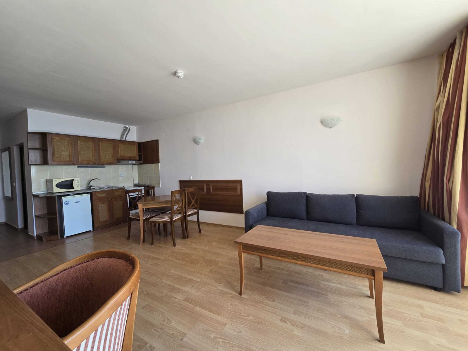 The apartment consists of a spacious living room, a separate bedroom, a bathroom with a shower, and a large balcony with unobstructed panoramic views of the Black Sea.