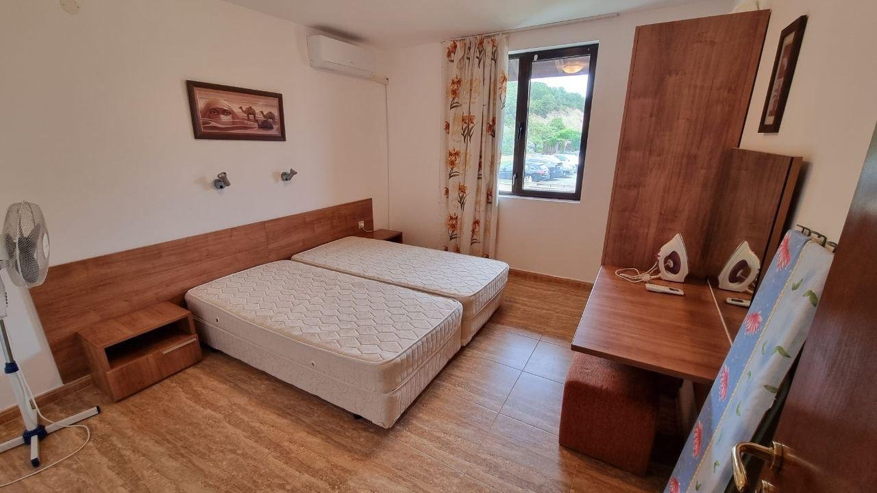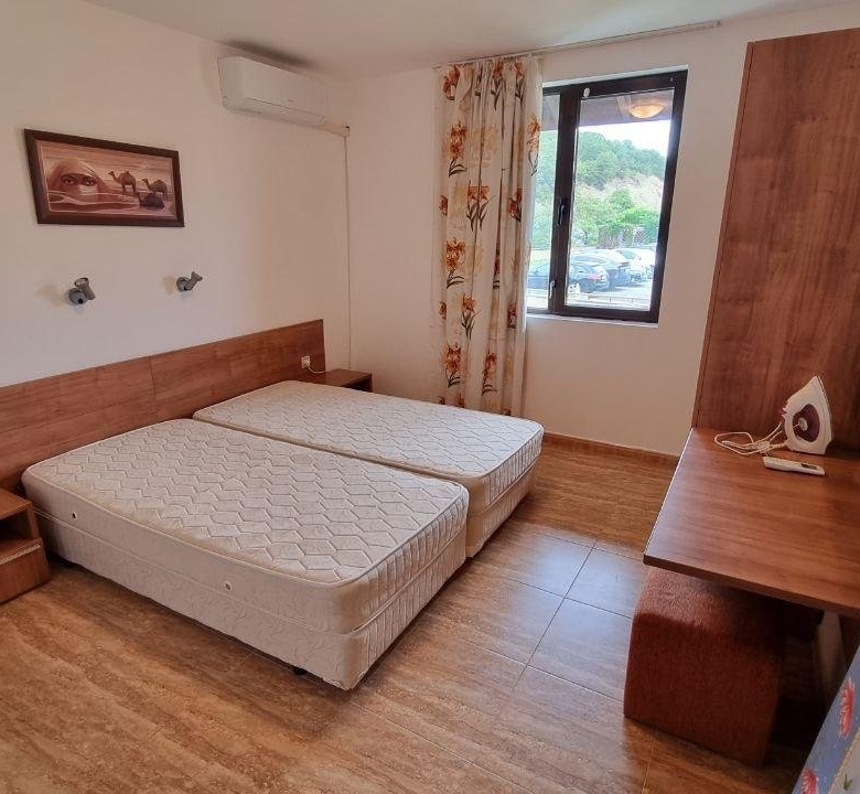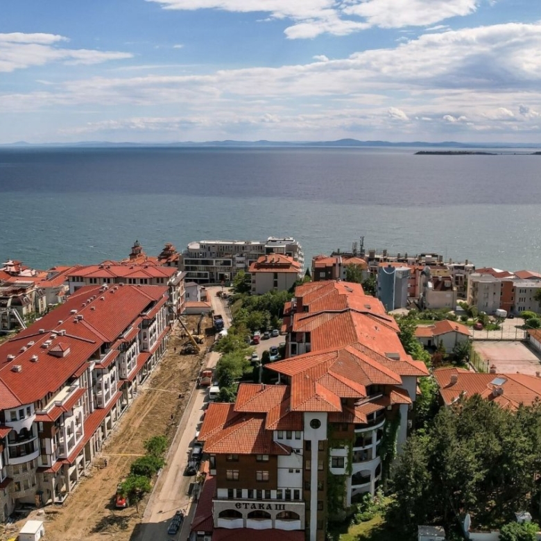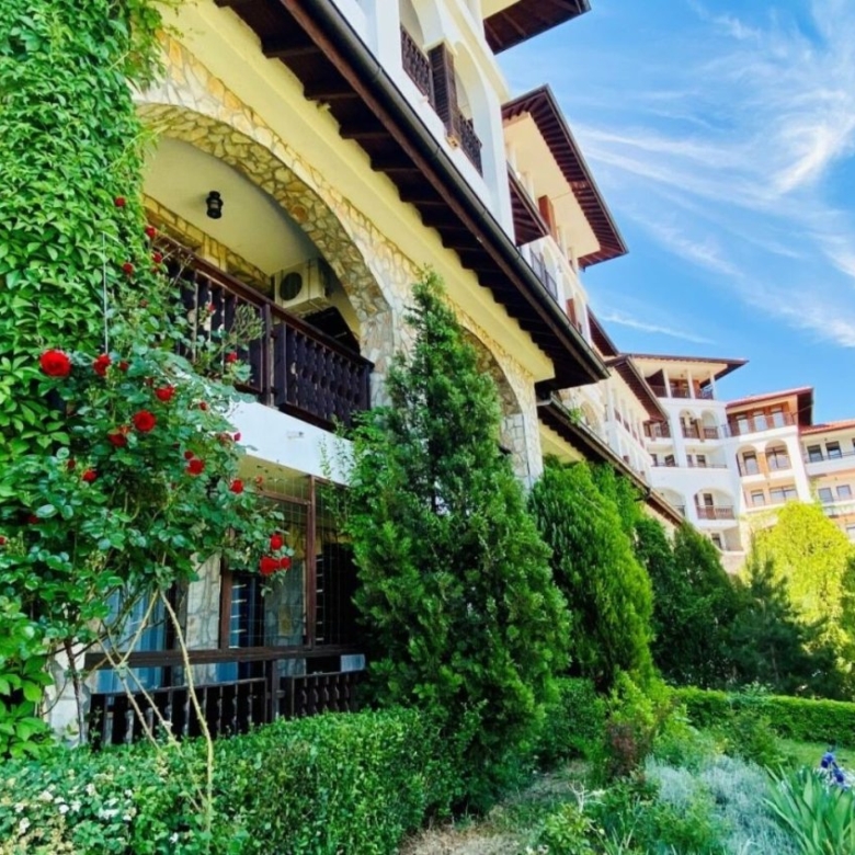 The complex is situated on the second sea line in an area with excellent infrastructure and is within walking distance of the Marina Dinevi yacht port. It offers a pool for children and adults, a well-maintained garden, a restaurant, a lobby bar, a playground, a reception, and parking facilities. Sveti Vlas is a unique location where the sea meets the eastern slopes of the Balkan Mountains, creating a special climate beneficial for people with respiratory issues. The combination of sea air and a nearby pine forest enhances the charm of this resort, which offers long, warm spring and autumn seasons as well as mild winters.