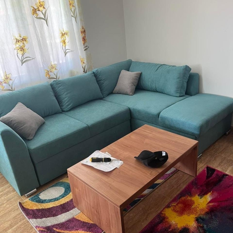 The apartment features a spacious hallway, a practical layout, and a bright living room with a large, easily accessible kitchen equipped with a microwave, oven, refrigerator, and air conditioning. The dining area is conveniently located, and the living room is furnished with a comfortable corner sofa and a coffee table. The bedroom is spacious, air-conditioned, and equipped with wardrobes, a mirror, and has direct access to the balcony.