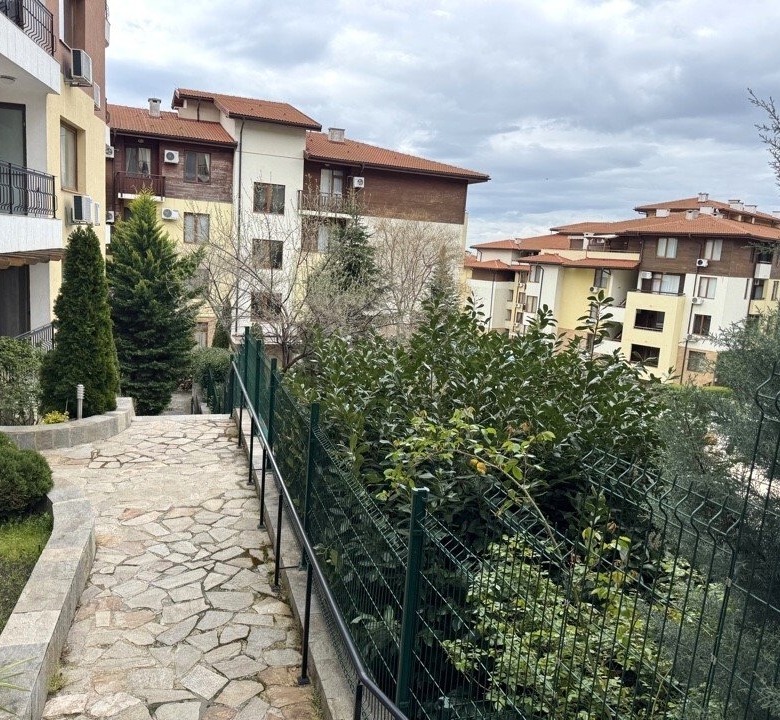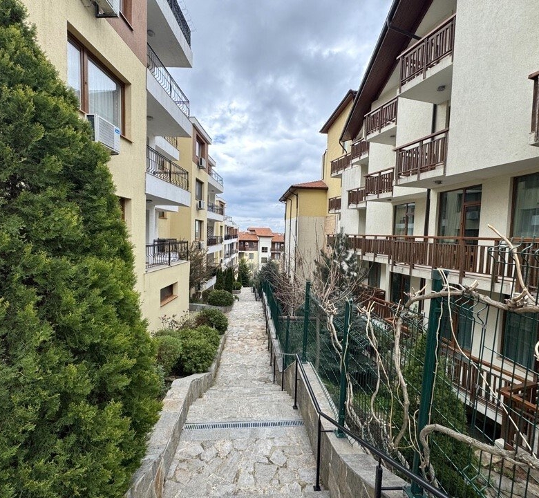The complex is located in the popular resort of Sveti Vlas, a charming town on the Bulgarian Black Sea coast, known for its peaceful atmosphere and picturesque scenery.