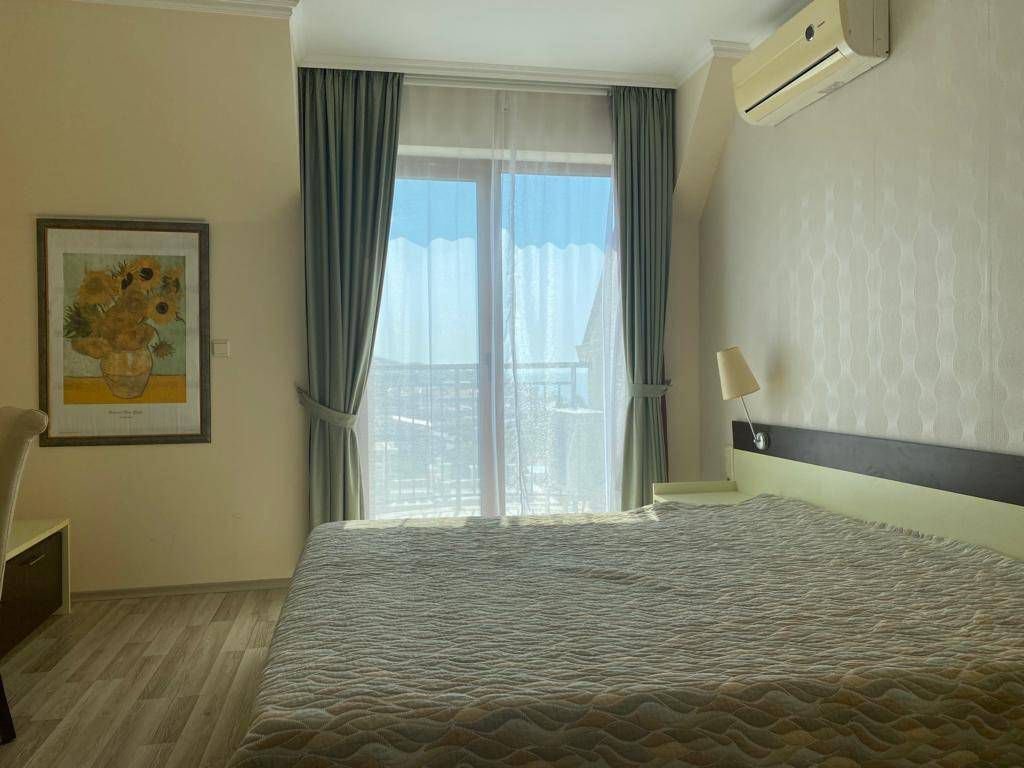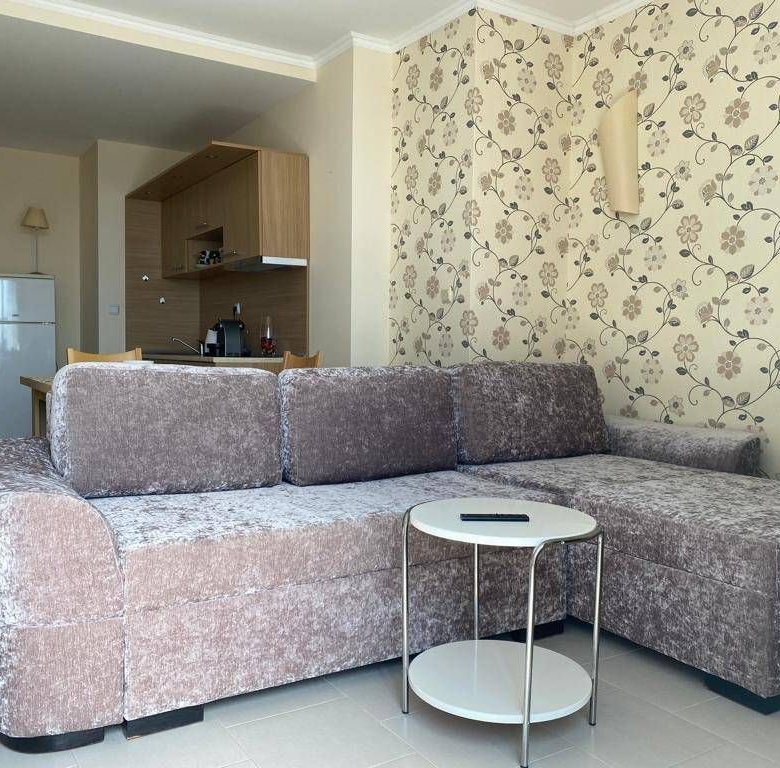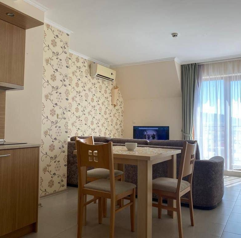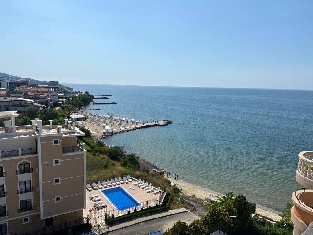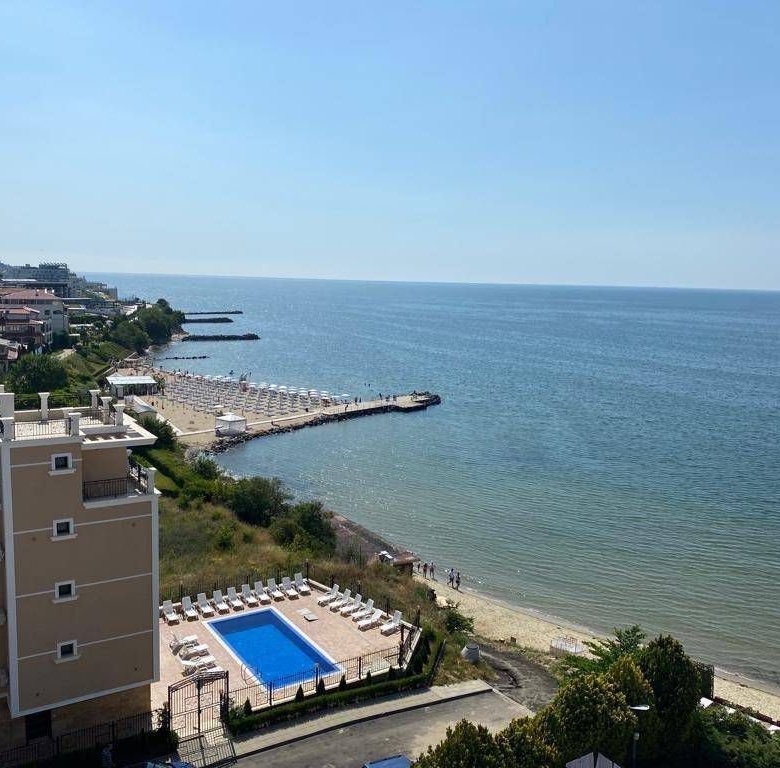 Spacious One-Bedroom Apartment with Sea View in a Frontline Complex in Sveti Vlas. The apartment has an area of 76 sqm and is located on the fifth floor. It consists of an entrance hall, a spacious living room with a kitchenette, a bedroom, a bathroom with a toilet, and a terrace with a beautiful view of the sea and the city. It is being sold fully furnished. Features include: seasonal outdoor pool, luxurious spa and fitness center with indoor pool, salt sauna, aromatic steam bath, Turkish bath, and a variety of fitness equipment; kids’ club, restaurant, reception, security, and parking.