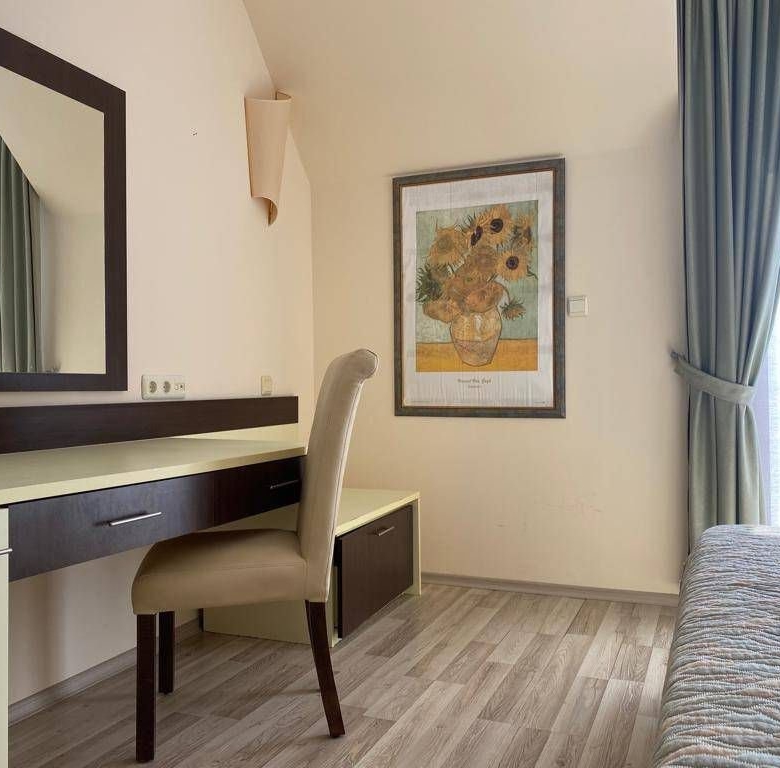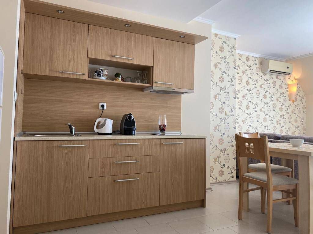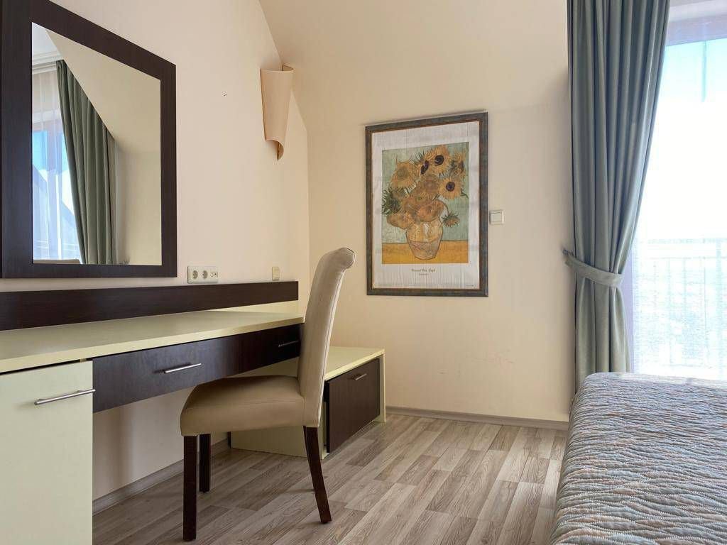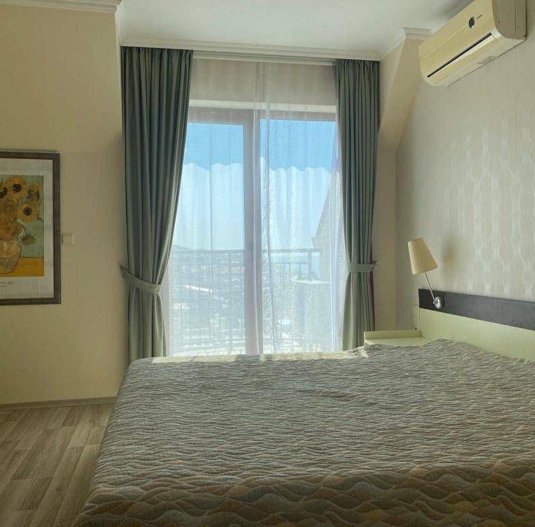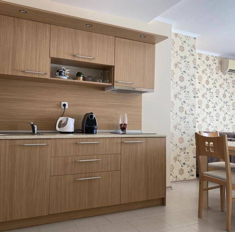 Spacious One-Bedroom Apartment with Sea View in a Frontline Complex in Sveti Vlas. The apartment has an area of 76 sqm and is located on the fifth floor. It consists of an entrance hall, a spacious living room with a kitchenette, a bedroom, a bathroom with a toilet, and a terrace with a beautiful view of the sea and the city. It is being sold fully furnished. Features include: seasonal outdoor pool, luxurious spa and fitness center with indoor pool, salt sauna, aromatic steam bath, Turkish bath, and a variety of fitness equipment; kids’ club, restaurant, reception, security, and parking.