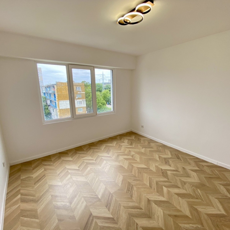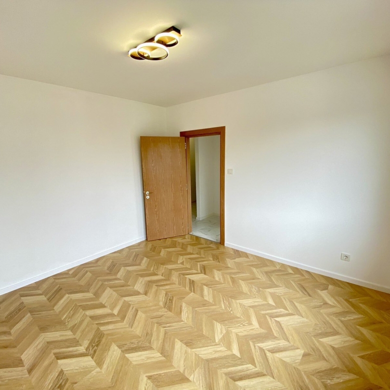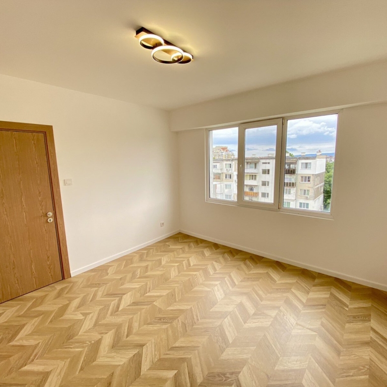 Two-room apartment in the Troshevo district, very close to Dobri Chintulov Primary School. The apartment is located on the 6th floor of a total of 8 in a well-maintained building with controlled access. The apartment faces east and west, has a built-up area of 60.59 m² and features the following layout: large living room of 24 m², bedroom of 13 m², kitchen of 10 m², L-shaped hallway, shared bathroom, and cellar. The living room has a private terrace. The apartment has been fully renovated and is offered as move-in ready.