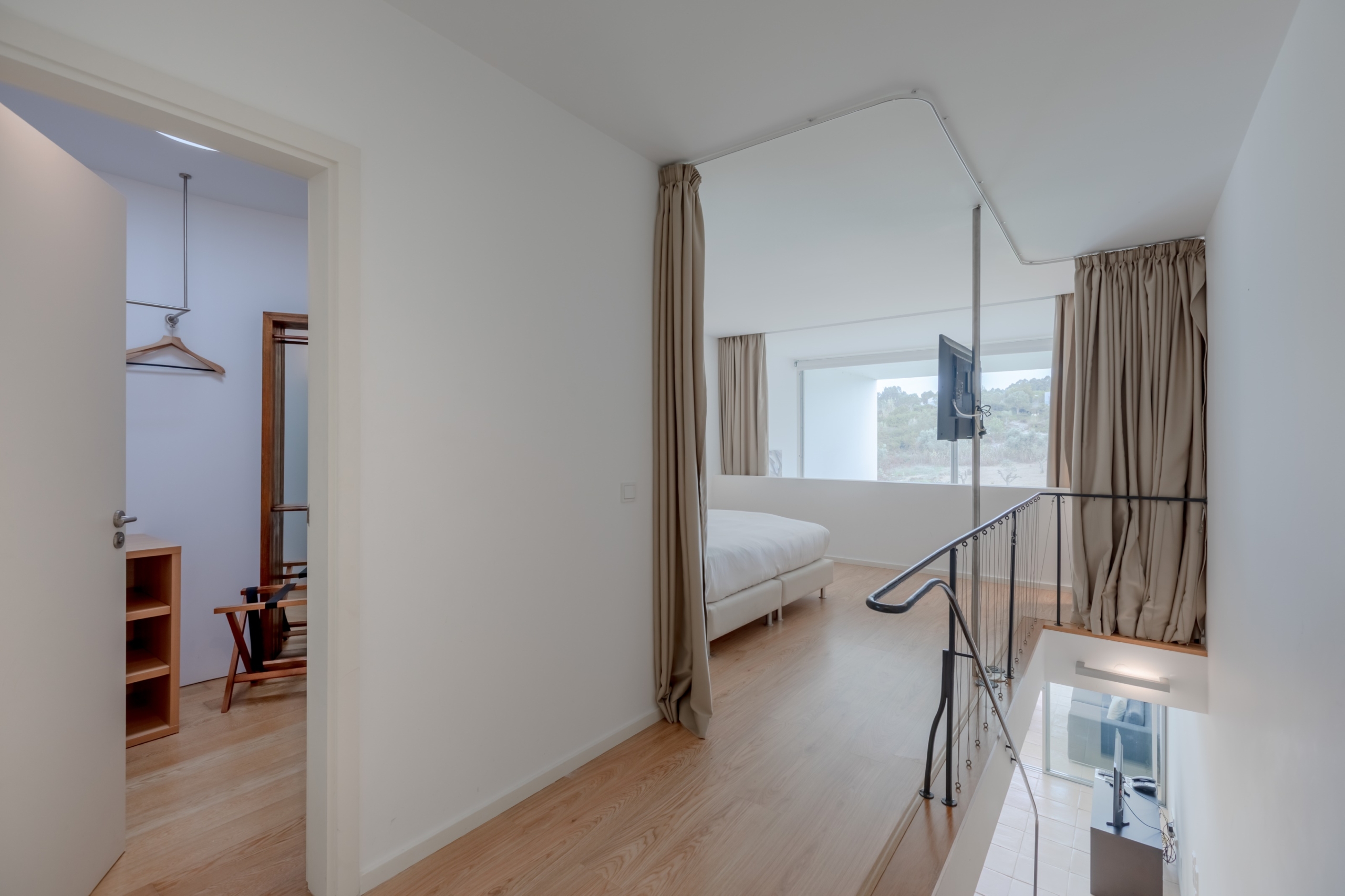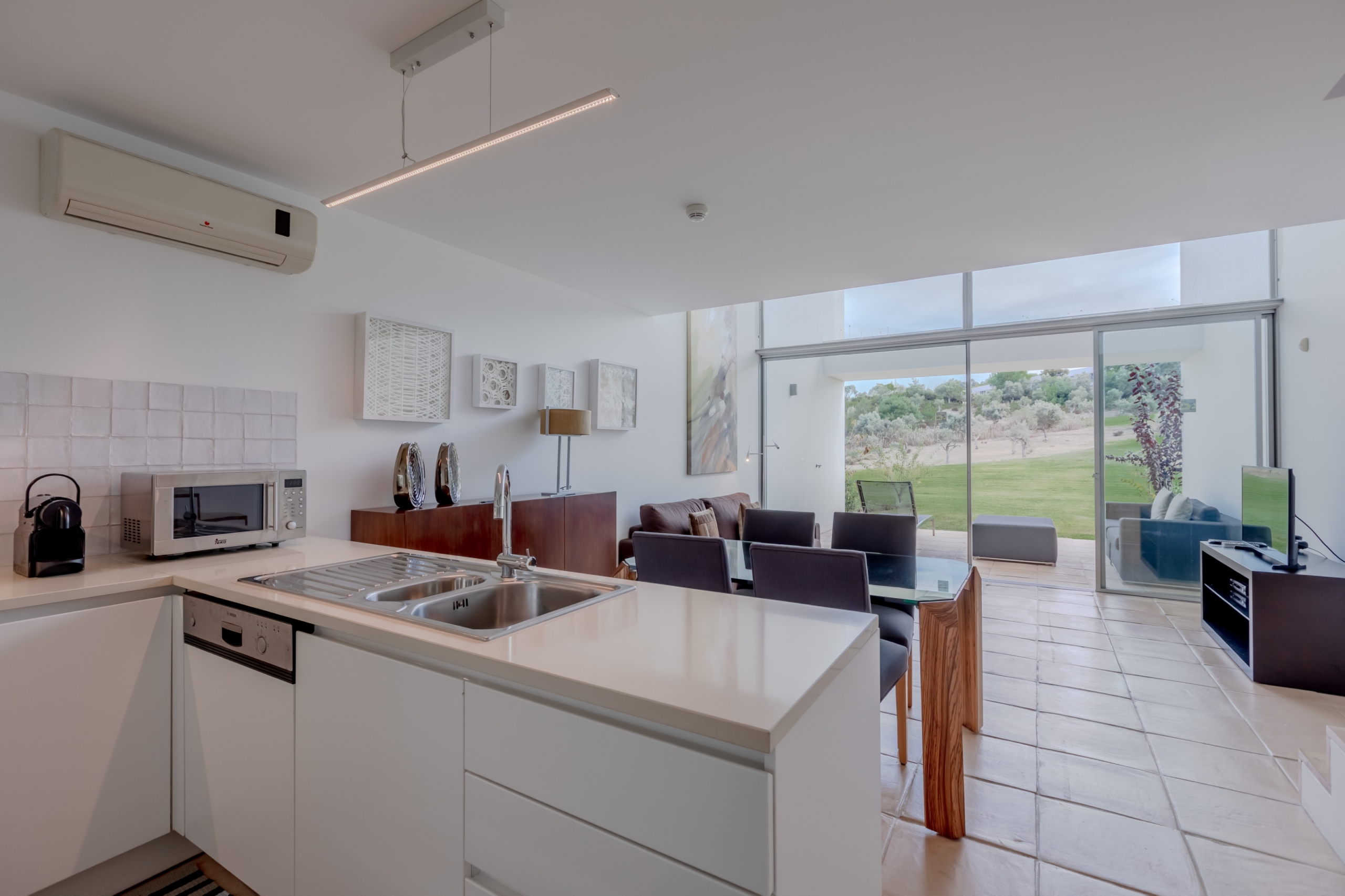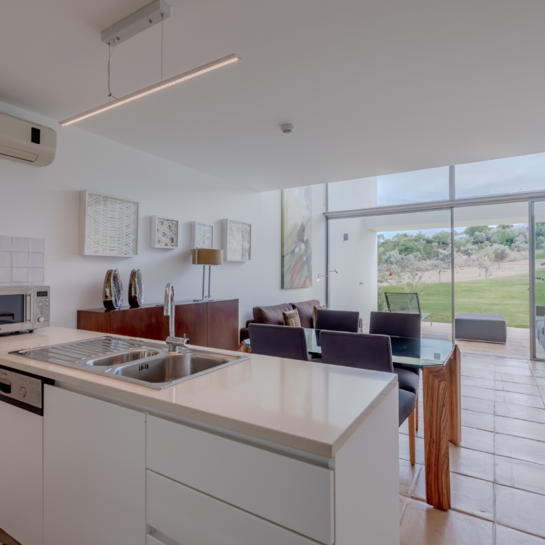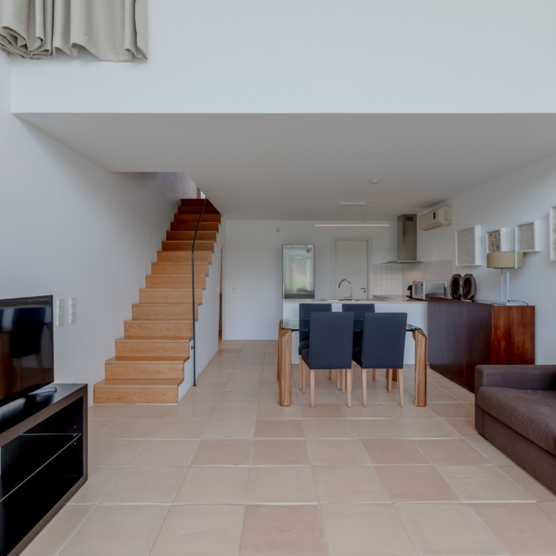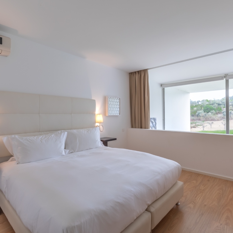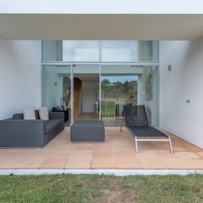 1-bedroom villa, 75 sqm (construction gross area), with communal garden and swimming pool, in the Bom Sucesso Resort gated community, in Óbidos. The villa, designed by Architect Nuno Graça Moura, stands out for its light thanks to the excellent southern sun exposure and views of the garden and swimming pool. Spread over two floors, it has, on the upper floor, a 15 sqm mezzanine bedroom, a walk-in closet and a bathroom. On the lower floor, a 28 sqm open plan living room and kitchen, with access to a covered 15 sqm terrace and a private garden (38 sqm). Both also have direc access to the communal garden of the plot where we can find the swimming pool (almost 20,000 sqm). There is also a full bathroom and pantry on this floor. The villa is equipped with reversible air conditioning, electric boiler and all kitchen equipment is BOSCH brand. It has a communal parking area for the plot residents. It is sold furnished and equipped with everything needed for tourist operation.