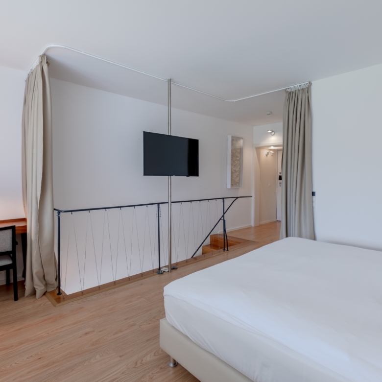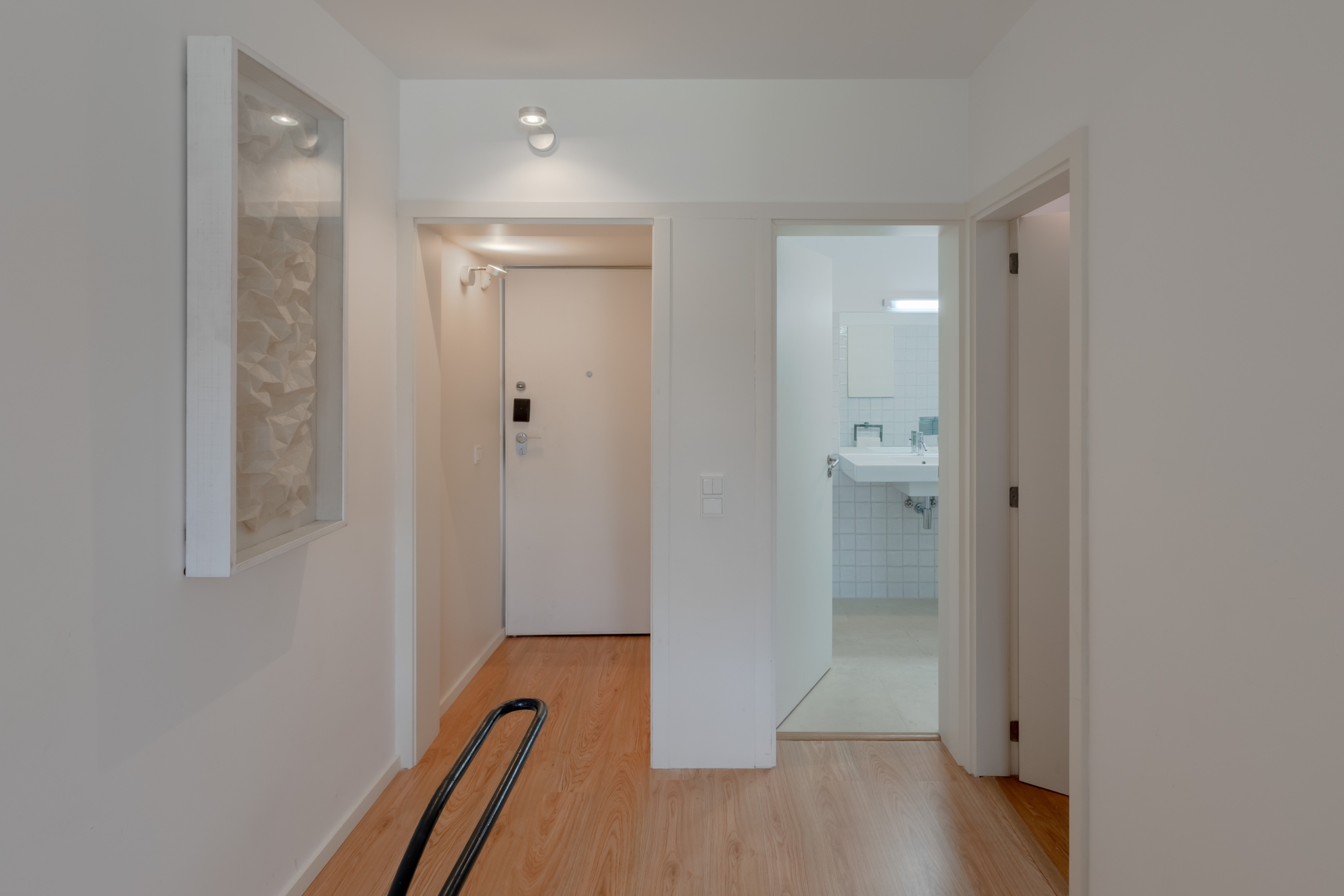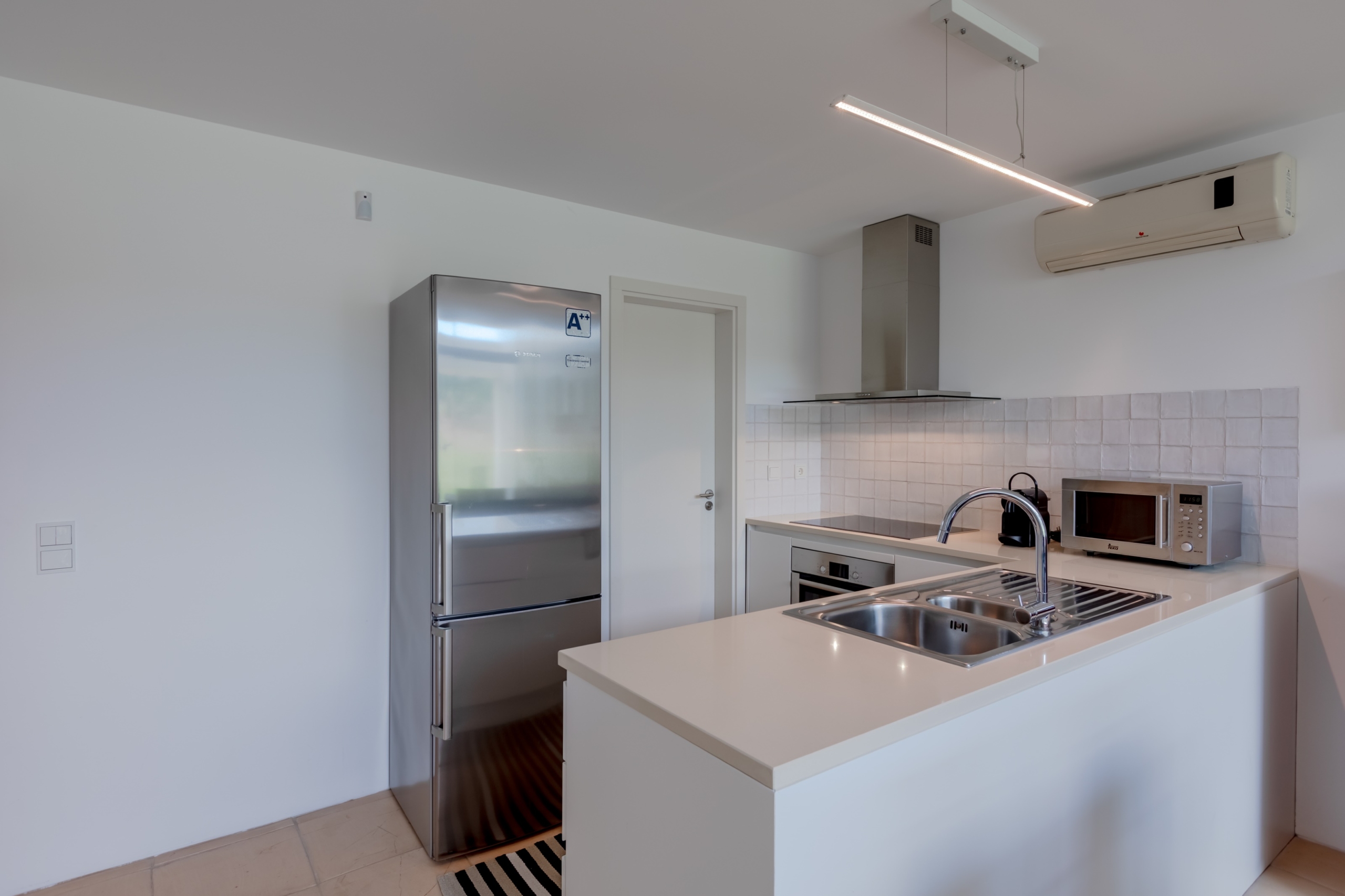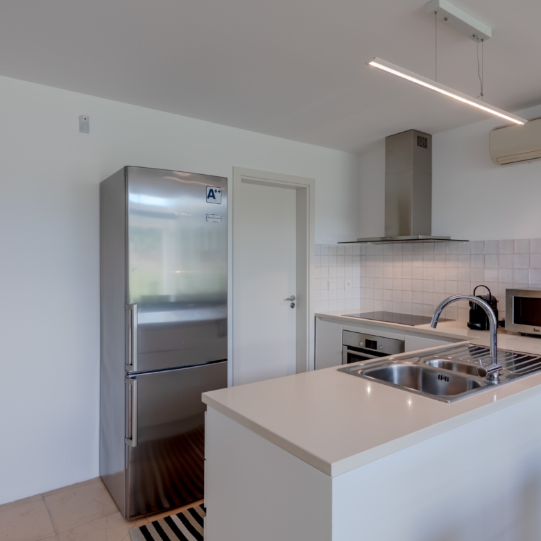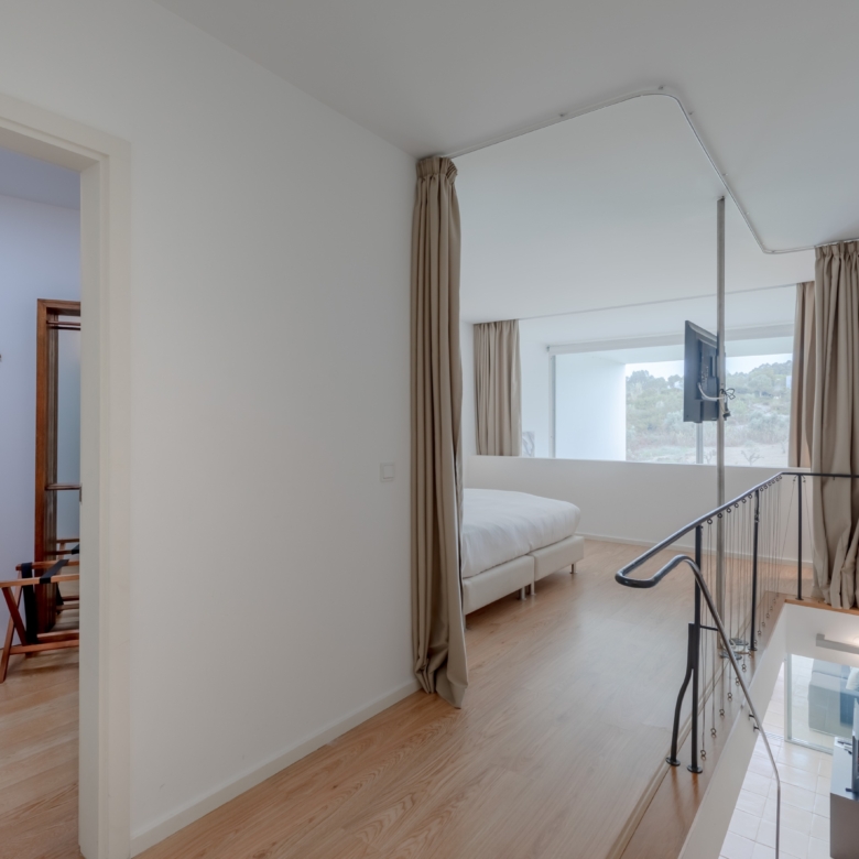 1-bedroom villa, 75 sqm (construction gross area), with communal garden and swimming pool, in the Bom Sucesso Resort gated community, in Óbidos. The villa, designed by Architect Nuno Graça Moura, stands out for its light thanks to the excellent southern sun exposure and views of the garden and swimming pool. Spread over two floors, it has, on the upper floor, a 15 sqm mezzanine bedroom, a walk-in closet and a bathroom. On the lower floor, a 28 sqm open plan living room and kitchen, with access to a covered 15 sqm terrace and a private garden (38 sqm). Both also have direc access to the communal garden of the plot where we can find the swimming pool (almost 20,000 sqm). There is also a full bathroom and pantry on this floor. The villa is equipped with reversible air conditioning, electric boiler and all kitchen equipment is BOSCH brand. It has a communal parking area for the plot residents. It is sold furnished and equipped with everything needed for tourist operation.