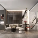 The layout is smart and practical — the open-plan living and dining areas flow together smoothly, so you’ll probably spend most of your time here. The contemporary minimalist design keeps things feeling calm, with neutral colors, light wood floors, and recessed ceiling lights that create a soft, welcoming atmosphere.