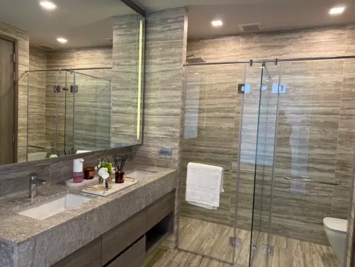 The bathroom has a spa-like quality, with natural stone tiles, a freestanding tub, and a double sink vanity with marble countertop. The shower is glass-enclosed with a rainfall showerhead, which adds a modern touch. Plenty of storage under the vanity and a large mirror with integrated lighting make this space both stylish and practical.