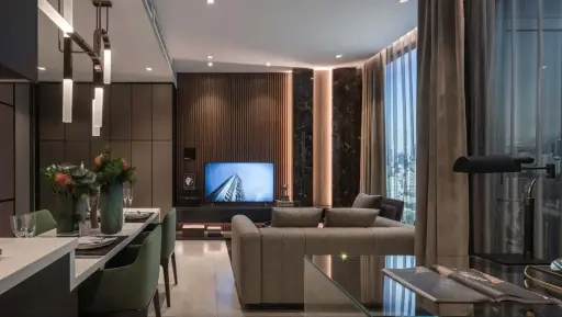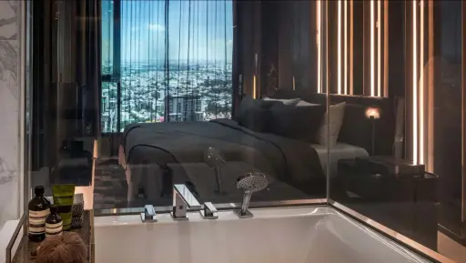 Both bedrooms come with their own bathrooms, so privacy isn’t an issue, and the overall minimalist design with clean lines and subtle wood paneling with illuminated black marble accents keeps the space feeling contemporary and polished.