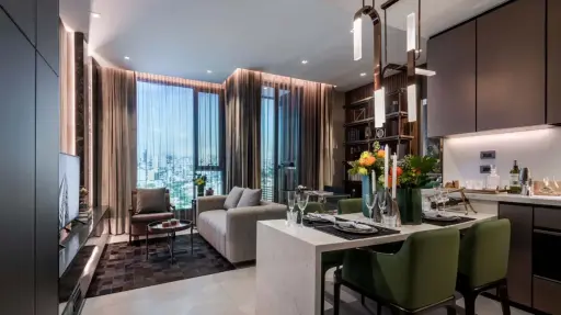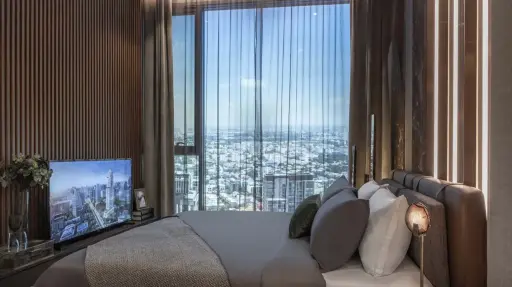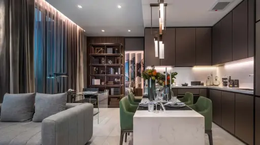 The open-plan layout really makes the most of the 72 sqm space, with the living room, dining area, and kitchen flowing seamlessly together. Large floor-to-ceiling windows bring in lots of natural light and give you a great cityscape view, perfect for relaxing evenings or entertaining friends.