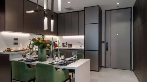 In the kitchen, you’ll appreciate the modern touches like under-cabinet lighting, white countertops, and dark cabinetry, plus integrated appliances that keep everything sleek and uncluttered. Storage’s handled nicely with built-in shelves filled with books and decorative pieces, and there’s even a secure entry door near the kitchen, which adds a practical touch.