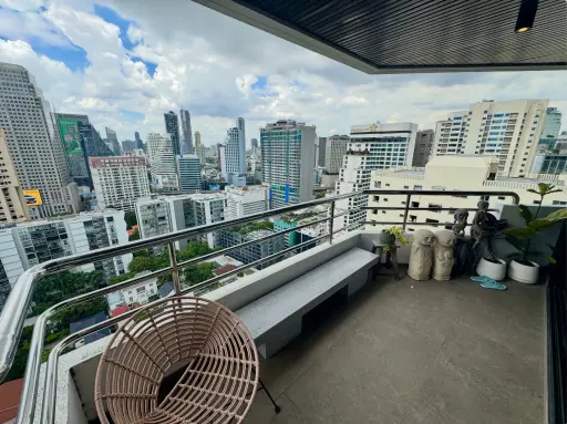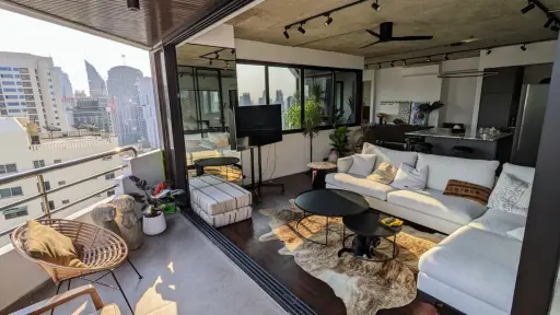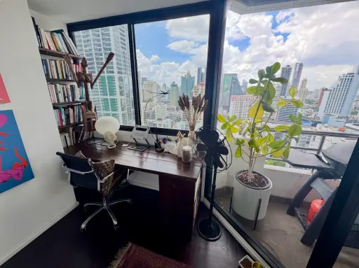 This unit features 2 bedrooms, 2 bathrooms, and 127 sq.m. of living space. A rare high-floor residence, it boasts expansive skyline views and a spacious private balcony. Fully remodeled in a modern New York loft style, the unit includes exposed concrete ceilings, an office nook, and a bright open-plan living area with floor-to-ceiling windows and triple-length terrace doors. With only 4 units per floor, privacy and exclusivity are assured.