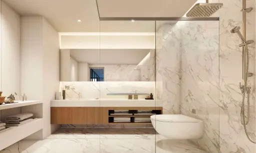The bedroom’s spacious with a big platform bed framed by built-in cabinetry with subtle gold accents that give it a refined touch. Lighting here is thoughtfully done with hanging bedside lamps and gold pendant lights, creating a nice atmosphere. In the bathroom, you’ll find floor-to-ceiling marble, a rain shower, and a floating wooden vanity with integrated lighting—modern and practical.