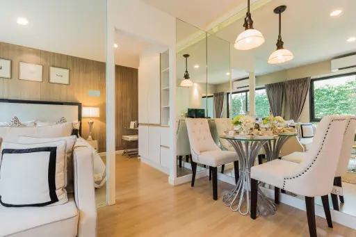 The dining area is simple but elegant, featuring a glass-topped round table with an eye-catching metal base, paired with four comfy upholstered chairs trimmed with subtle nailhead details. It’s an easy spot for dinner or even working from home.