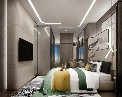 The main bedroom is cozy yet modern, featuring a large, comfy bed with plenty of pillows and a cushioned headboard. There’s also a built-in mirrored wardrobe with sliding doors and a dressing table, so getting ready is straightforward. The second bedroom is geared toward a child’s needs, with a single bed, wall-mounted shelves for books and toys, plus a playful hanging round chair by the window. Both rooms follow a calm, neutral, and pastel color scheme that will help keep things relaxing.