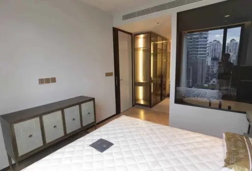 Both bedrooms have laminate or wood flooring, and the master has a large mattress and a cool built-in glass-fronted wardrobe with lighting. Sliding glass doors in the living area open up to a balcony, perfect for catching the cityscape view or some fresh air.