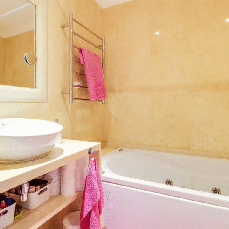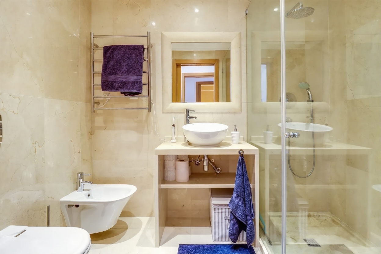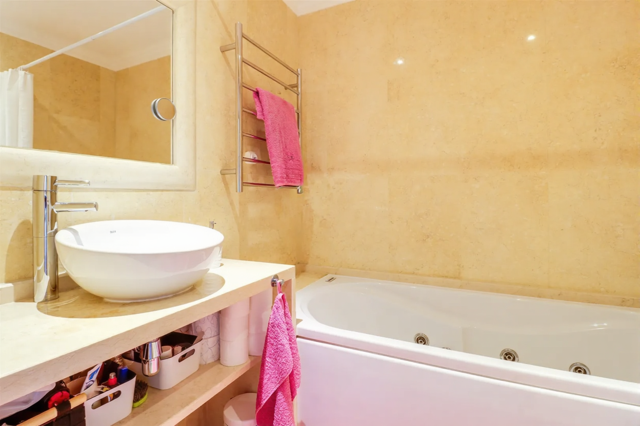 The apartment features bedrooms with built-in wardrobes for ample storage. The master suite includes an elegant bathroom with a hydromassage bathtub, providing absolute relaxation.