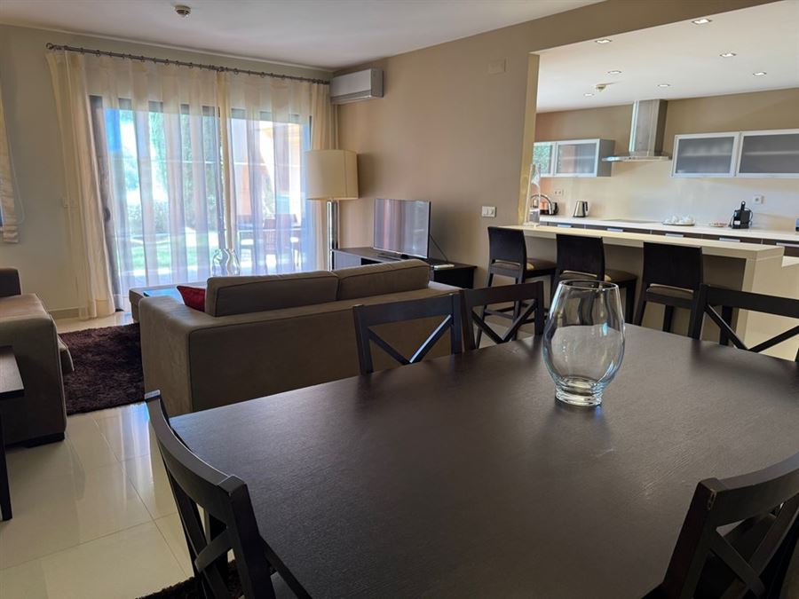 The modern, fully equipped kitchen complements the stylish interior, while both generously sized bedrooms provide a serene atmosphere and benefit from direct access to outdoor areas. Situated on a desirable corner plot, the apartment enjoys enhanced privacy and abundant natural light throughout.