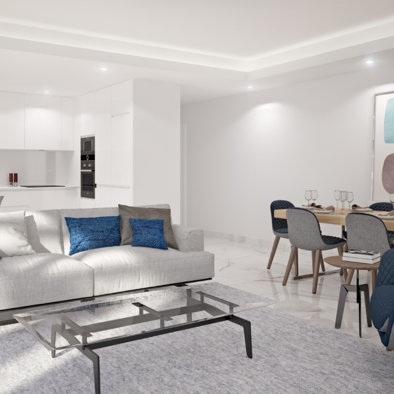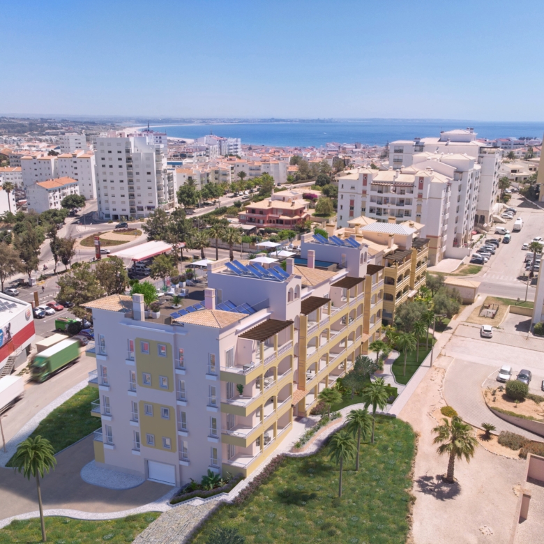 2-bedroom apartment, 124 sqm (gross floor area), new, with terrace and one parking space, in a gated community with pool, in Ameijeira, Lagos, Algarve. It has solar panels, double glazing, elevator, underfloor heating, central vacuum and air conditioning. Large open plan living room with 36 sqm, fully equipped kitchen, two bedrooms, one en-suite with 21 sqm and direct access to the terrace. Building with a swimming pool on the terrace, with swimming system with automatic cover, solarium, views over the city, the sea and the green areas of Lagos.It is 5-minute walking distance from a shopping area and 20 minutes from the city beaches. 10-minutes driving distance from Lagos bus terminal, 12-minutes from Lagos municipal market and the railway station, 15-minutes from Colégio Luz São Gonçalo. 10-minutes from the access to A22 and from Portimão, 45-minutes from Faro Airport and two and a half hours from Lisbon and Seville Airports.