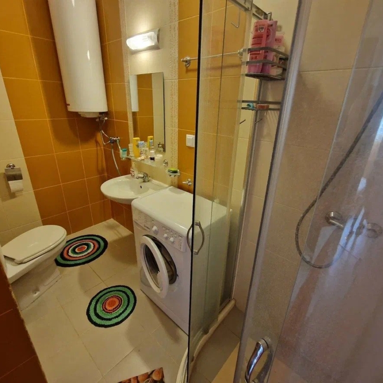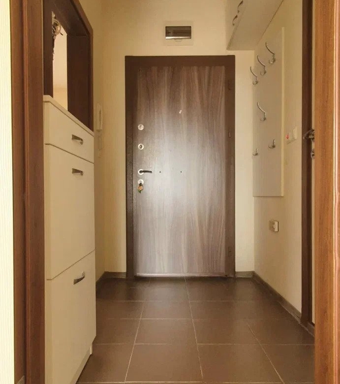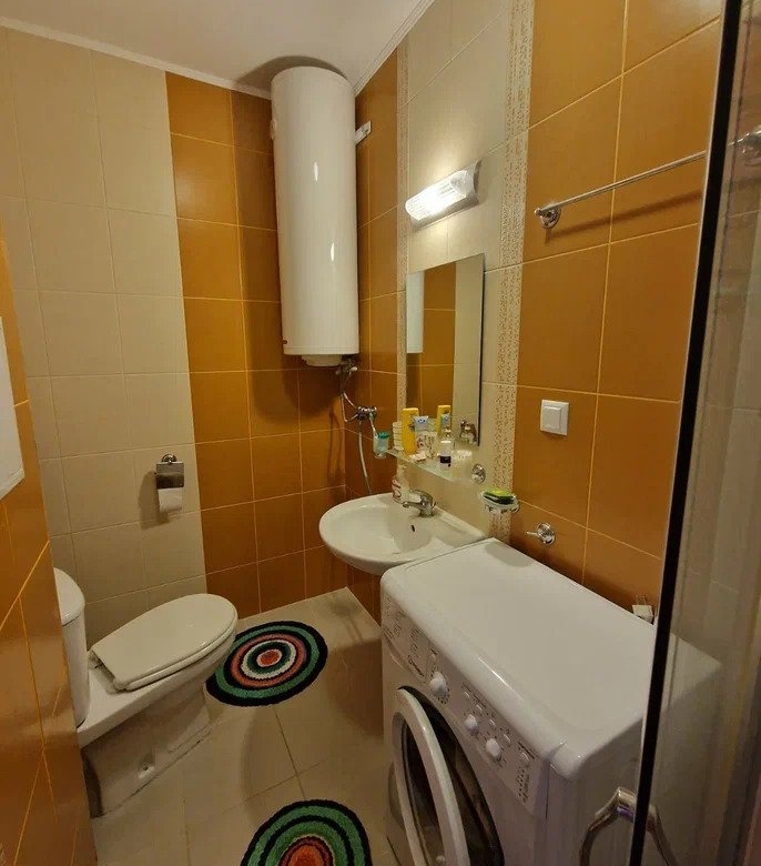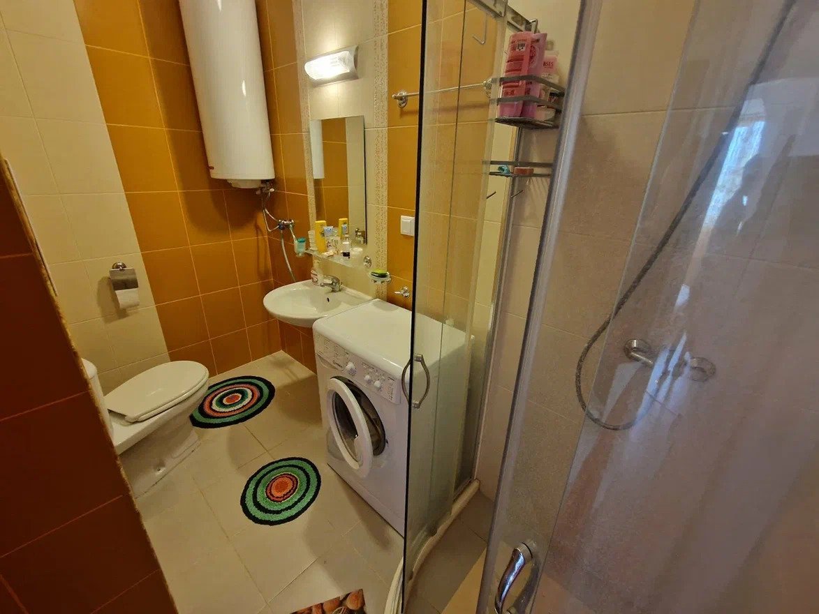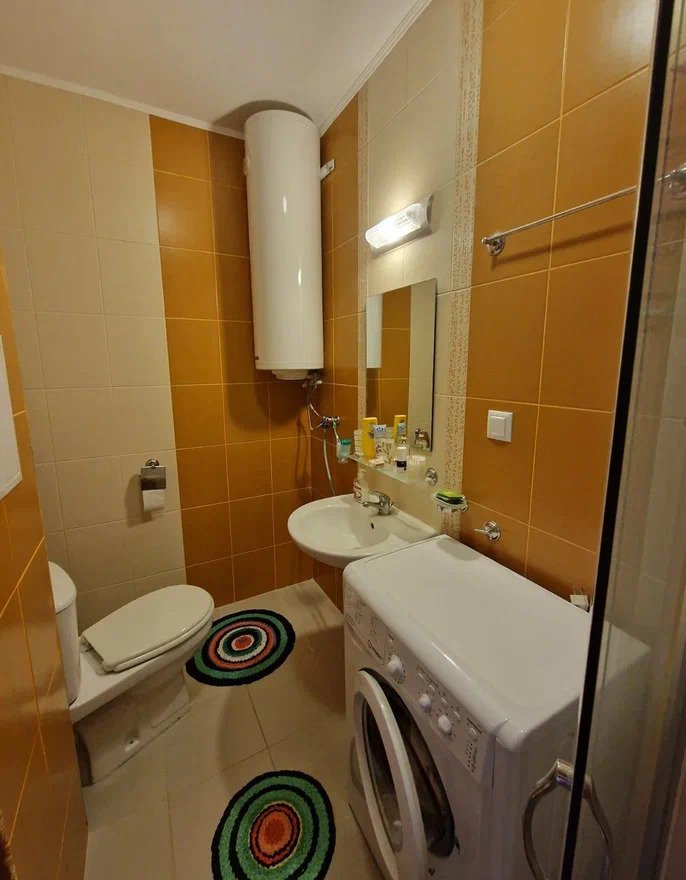 We offer you a fully furnished apartment with sea view in Nessebar, Bulgaria. The apartment has a living area of 77 square meters and is located on the 6th floor with an elevator. It features an entrance area, a living room with an open-plan kitchen, and access to the terrace with a view of the sea. There are also two bedrooms, one of which has a double bed and access to the terrace with a sea view. The second bedroom has a sofa bed and decorative elements. The bathroom is designed as a shower bath and includes a washing machine. The terrace offers a view of the sea. The annual homeowners’ association fee is 95.00 euros.