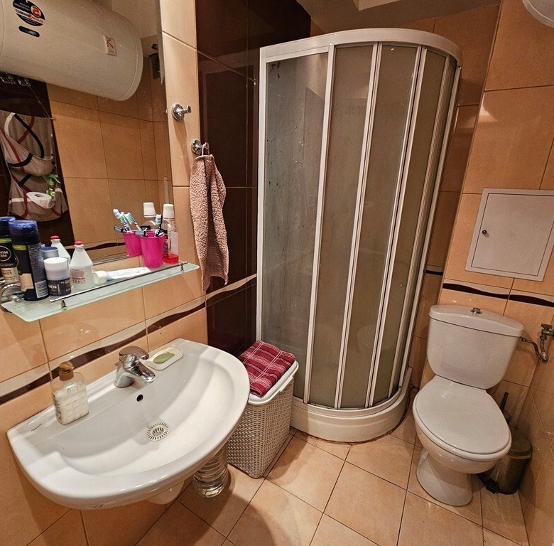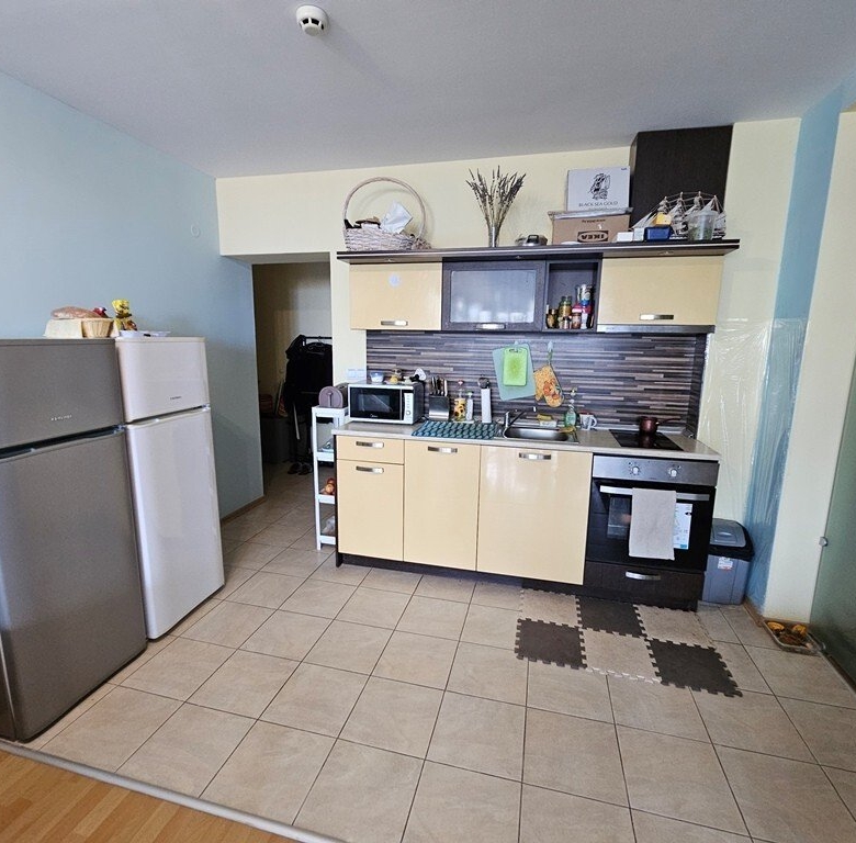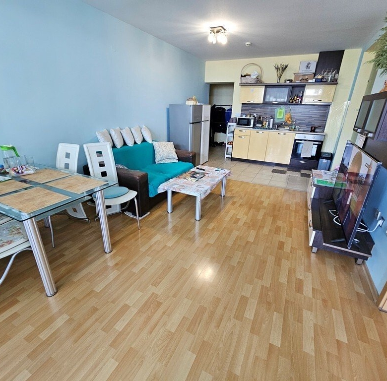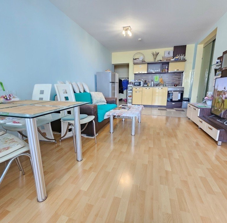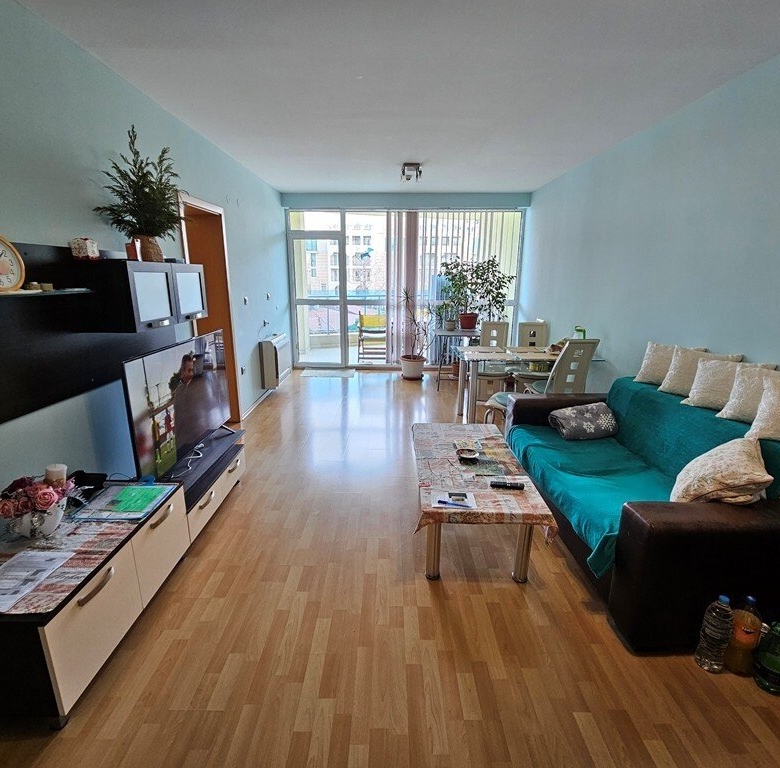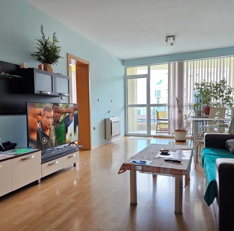 This is a spacious 3-room apartment on the second floor of the Marina Holiday Club in Pomorie, only 200 meters from the beautiful beach. The city center is a 5-minute drive away, Burgas is 15 minutes away, and Sunny Beach is also 15 minutes away.