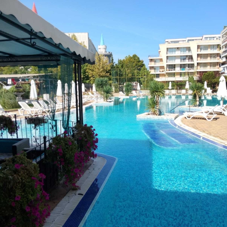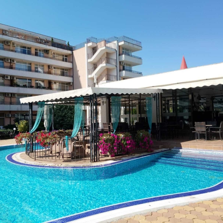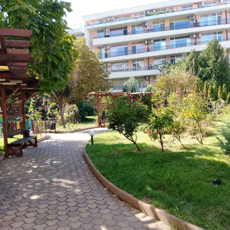 The distance to the beach is 700 meters, just a few minutes’ walk from the bus station, from which buses depart in all directions of Bulgaria. There is a “Molodost” supermarket, pharmacies, vegetable shops, souvenir shops, a beauty salon, and an exchange office 30 meters away. It is only a few minutes’ walk to numerous bistros and restaurants where you can enjoy a very tasty and affordable lunch. The famous entertainment center “Camelot” is located 20 meters from the complex, where you can visit a restaurant, a game room, and go bowling. Sports enthusiasts don’t have to go far, as there is a large fitness room within the building itself.