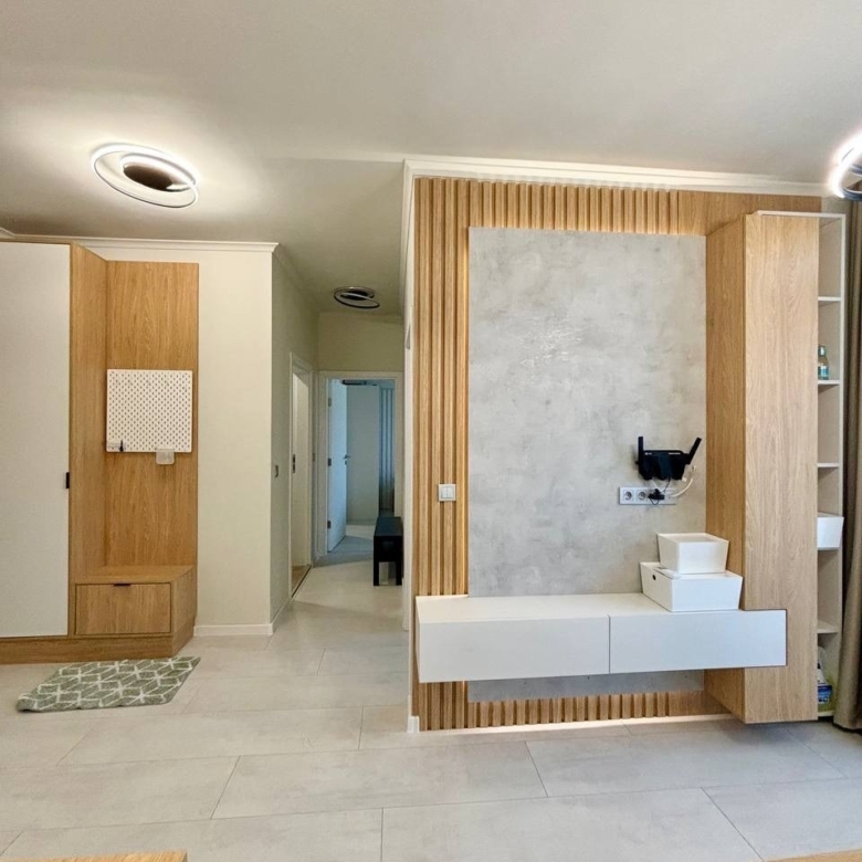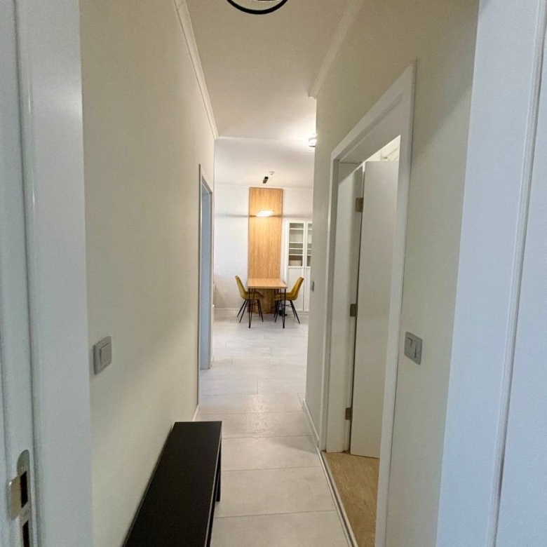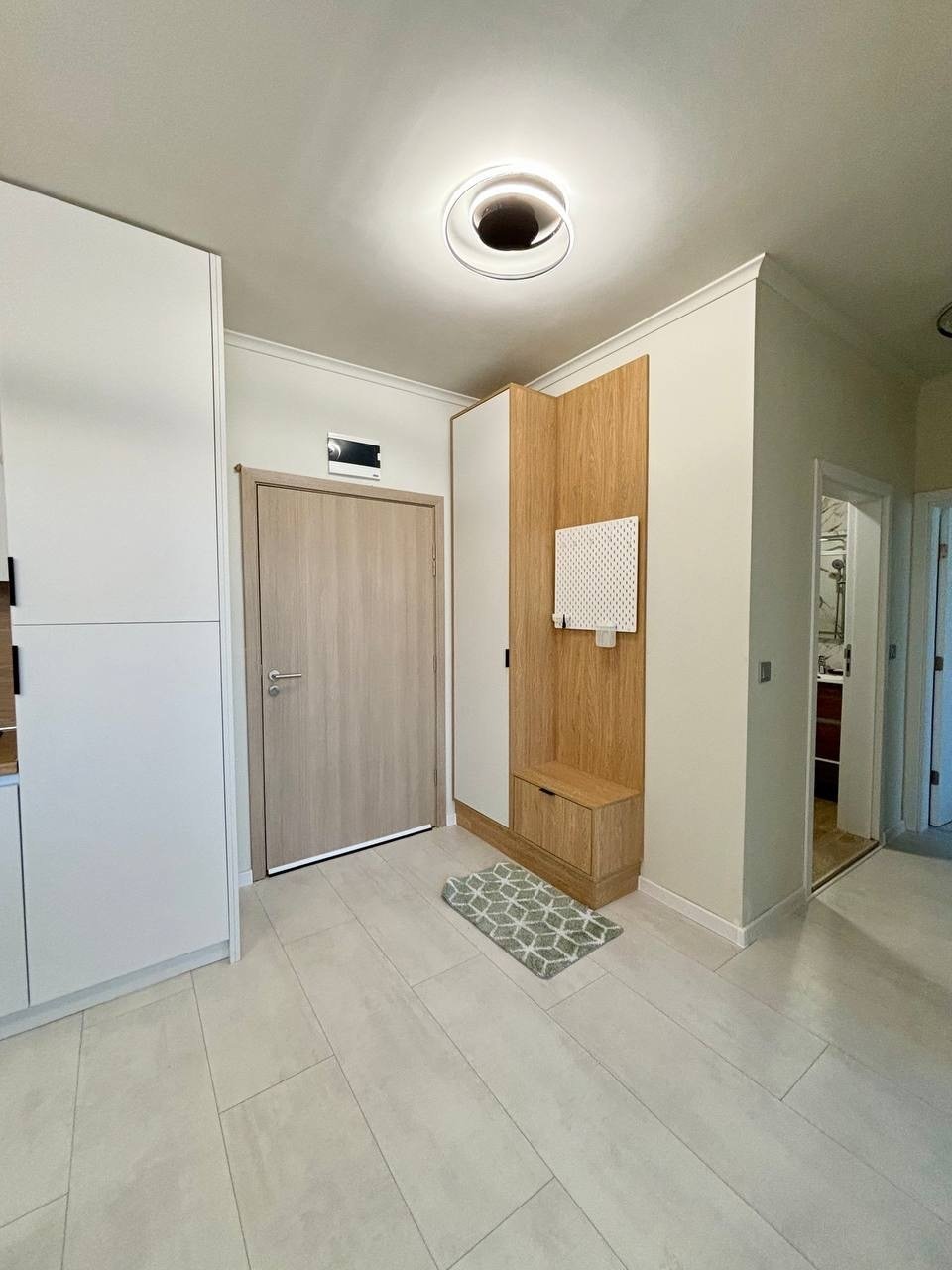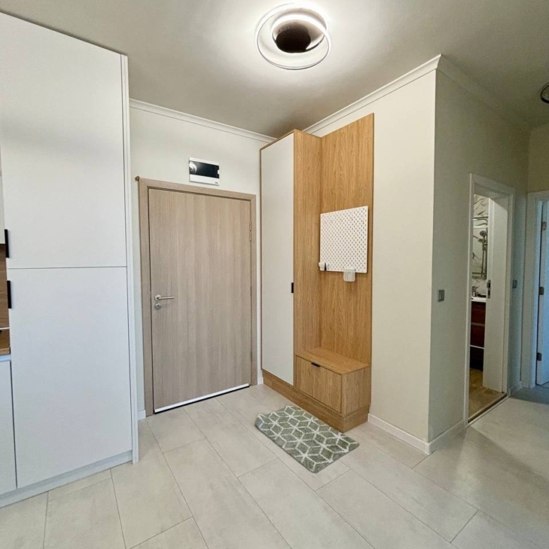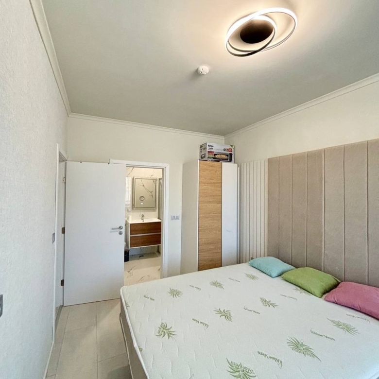 The property is located in a brand-new complex built in 2024. The main bedroom is equipped with air conditioning, a new bed with a seating area, a wardrobe, and stylish lighting. The second bedroom also has a new bed, decorative interior lighting, wardrobes, and other brand-new details. The living room is equipped with air conditioning, a modern corner sofa, a small coffee table, a dining area, and a beautifully designed kitchen in white tones with elegant lighting details. The spacious corridor includes a built-in wardrobe for extra storage. The bathrooms are brand new and fully equipped, featuring a washing machine and luxurious marble-style tiles.