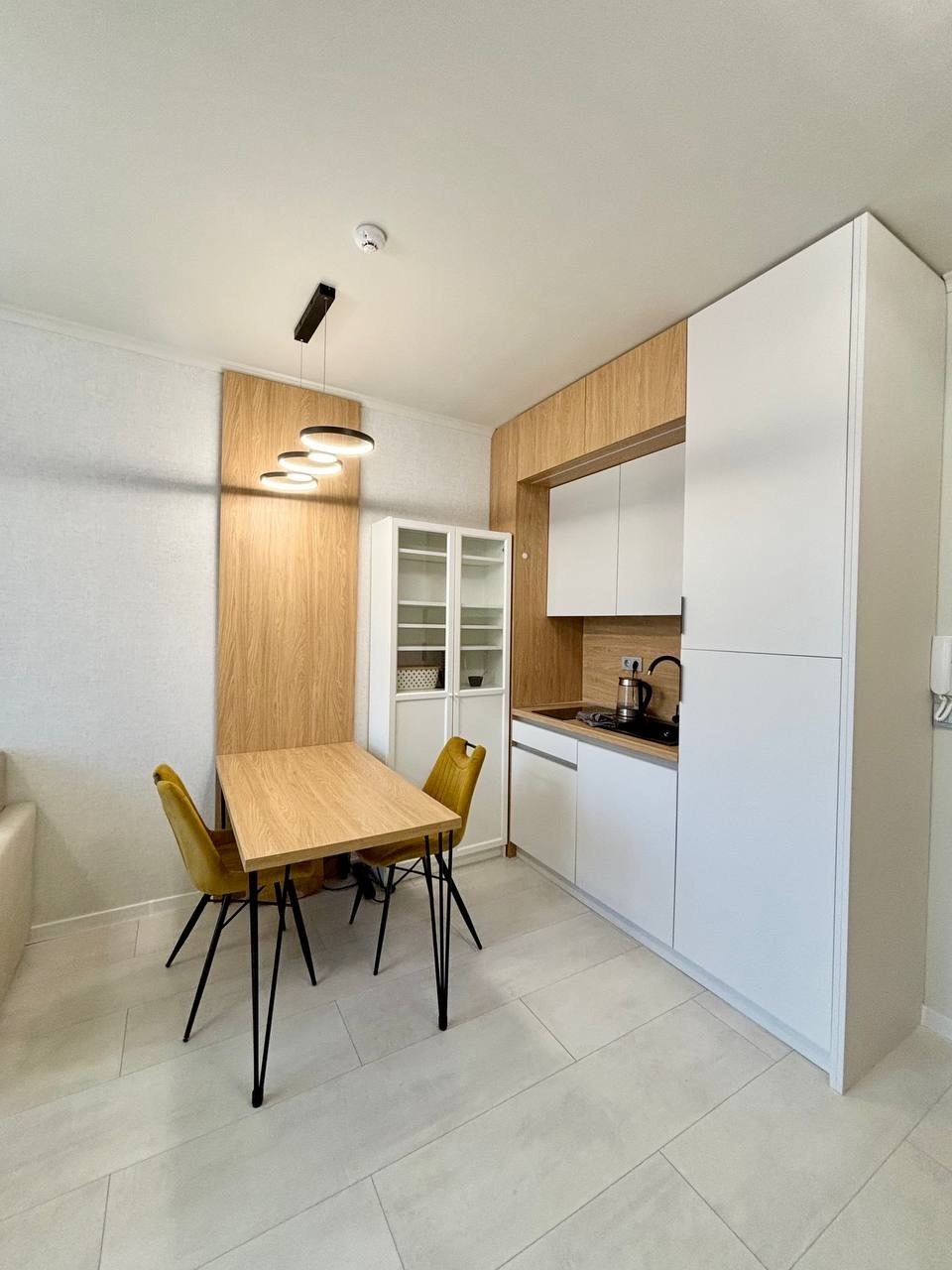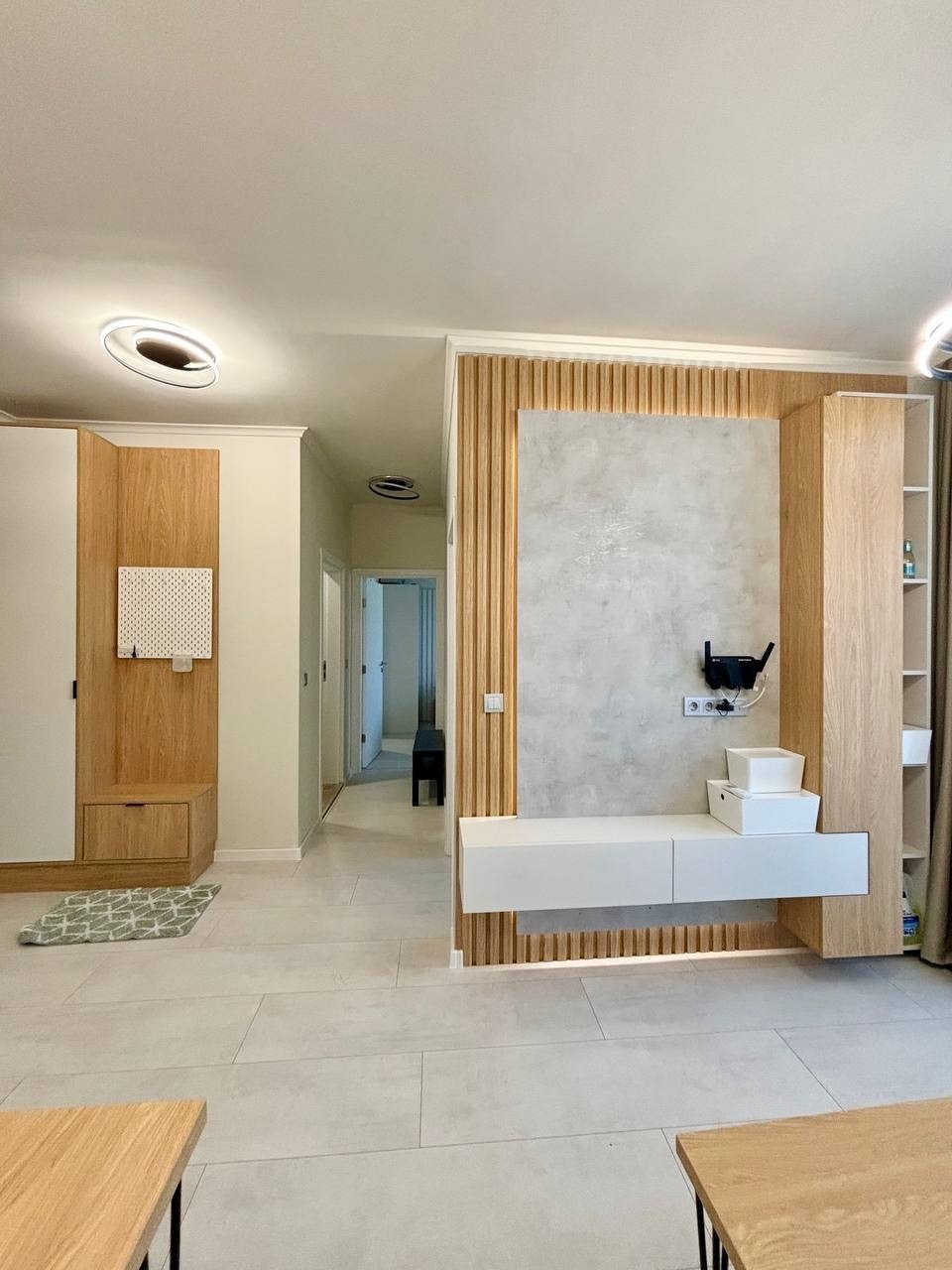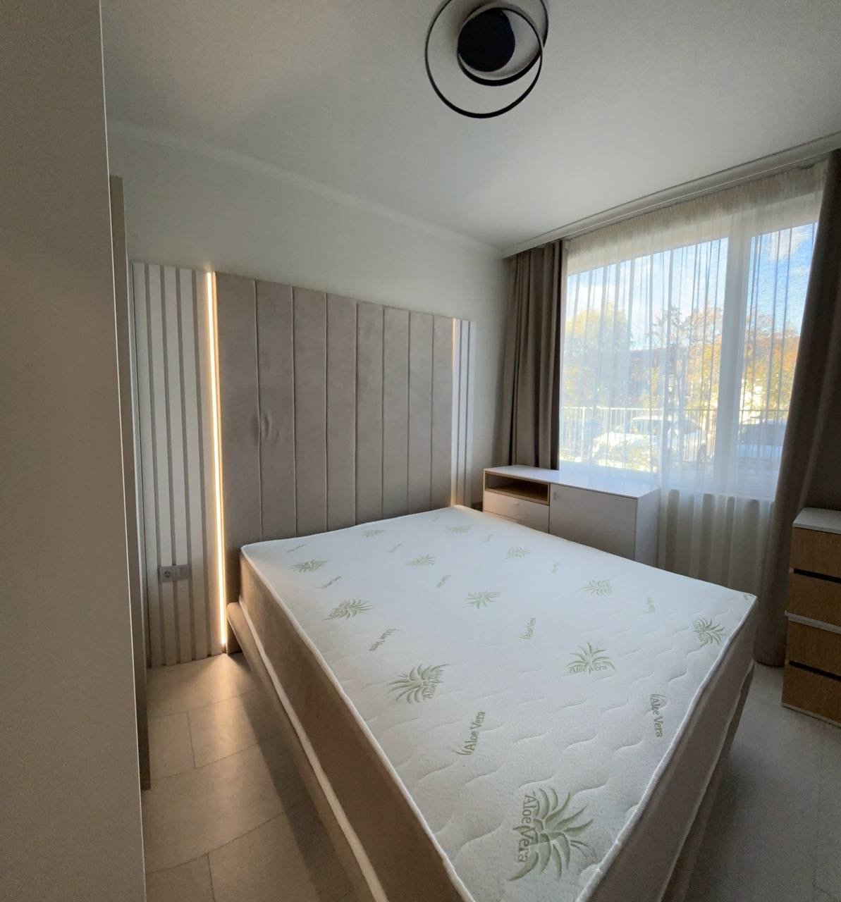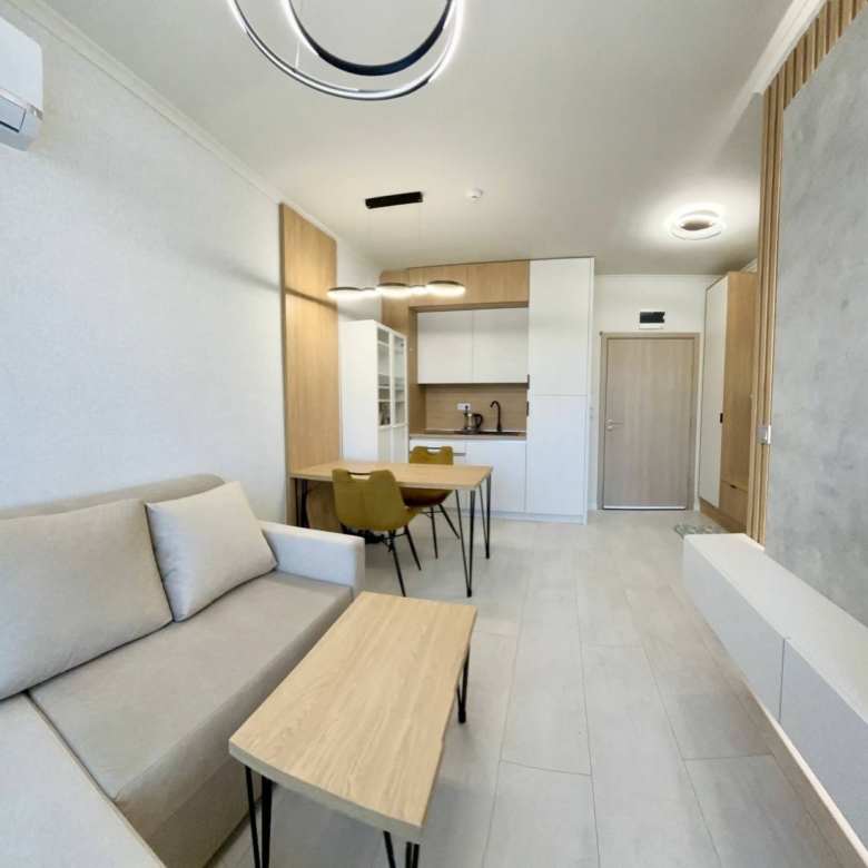 The property is located in a brand-new complex built in 2024. The main bedroom is equipped with air conditioning, a new bed with a seating area, a wardrobe, and stylish lighting. The second bedroom also has a new bed, decorative interior lighting, wardrobes, and other brand-new details. The living room is equipped with air conditioning, a modern corner sofa, a small coffee table, a dining area, and a beautifully designed kitchen in white tones with elegant lighting details. The spacious corridor includes a built-in wardrobe for extra storage. The bathrooms are brand new and fully equipped, featuring a washing machine and luxurious marble-style tiles.