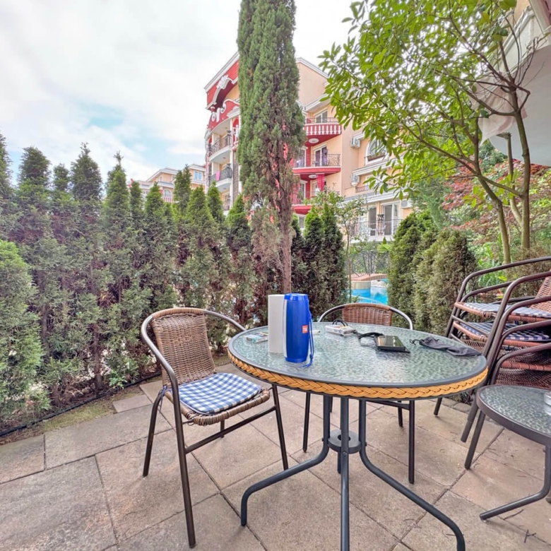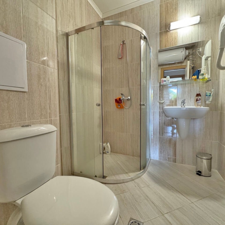 For sale is a bright and spacious three-room apartment with an area of 78 m², located on the ground floor of the well-maintained residential complex Messembria Fort. The development is situated in a quiet and green area in the southern part of Sonnenstrand, only about 500 meters from the popular Cacao Beach.