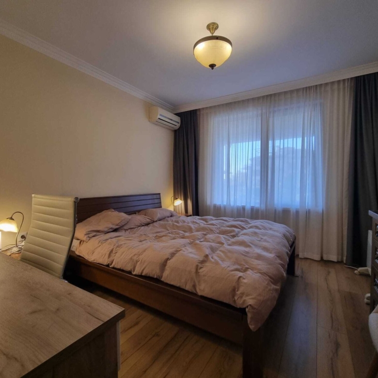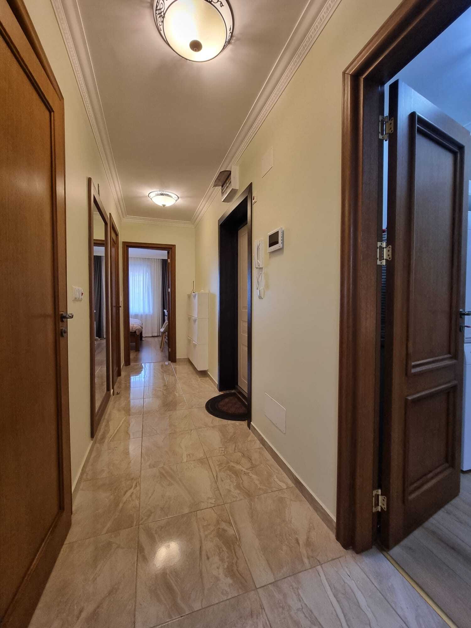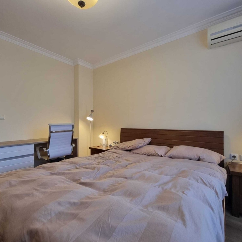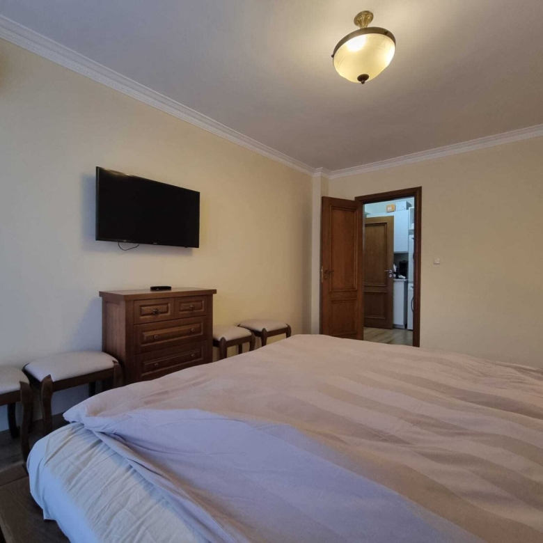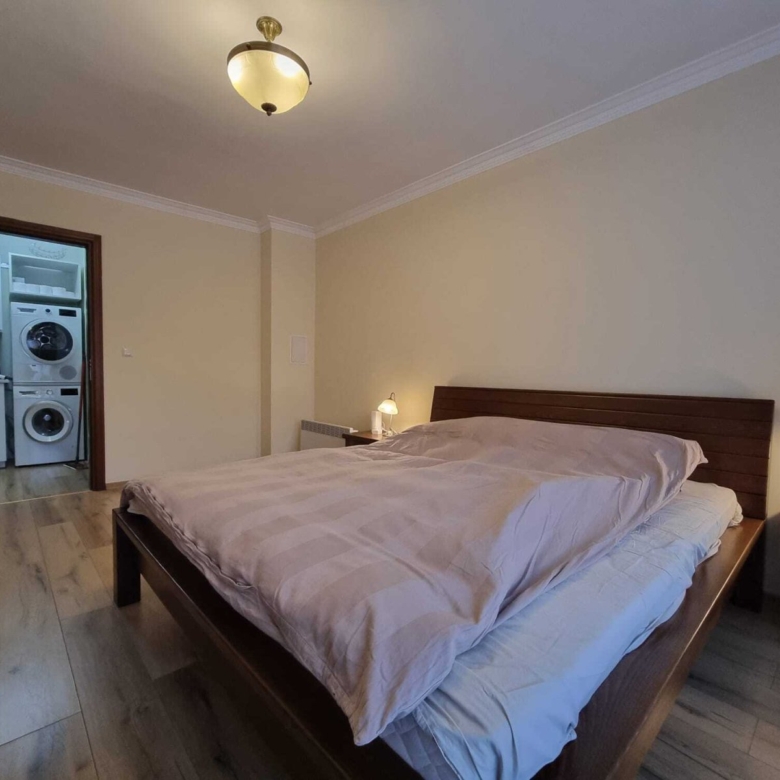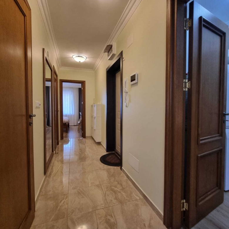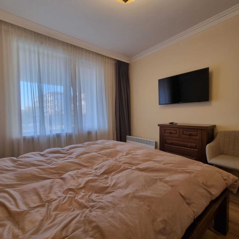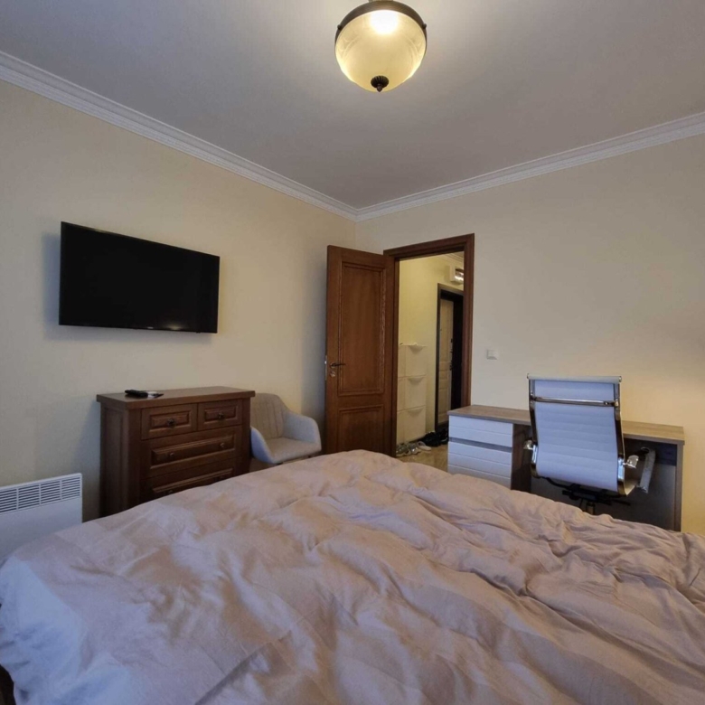 We offer for sale an excellent two-room apartment in the “Porto Paradiso” complex, located in Sveti Vlas, Bulgaria. The apartment is on the second floor and has a total area of 99.8 m². It consists of: an entrance hall, a living room with a kitchenette, two bedrooms, two fully equipped bathrooms with showers, one of which has a laundry room, a separate dressing room, and a secluded terrace with partial sea views. The apartment is fully furnished with high-quality furniture and appliances and is ready for comfortable permanent living, summer vacations, or rental.