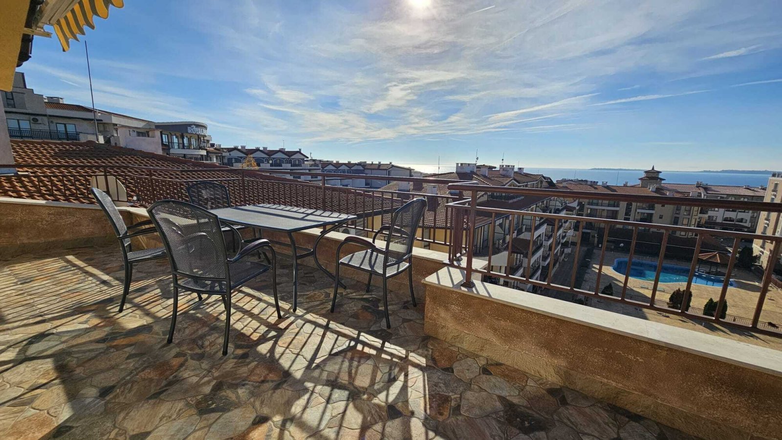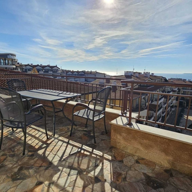 We present to you a 3-room penthouse apartment with sea view in Aqua Dreams, Sveti Vlas, Bulgaria. The apartment is located on the 5th floor of the building, with a total area of 165 m2. The apartment consists of: an entrance hall, a living room with kitchenette and dining area, two spacious bedrooms, two bathrooms with showers, and a large panoramic terrace with stunning sea views, a grill, dining area, and sun loungers under a canopy roof. The apartment is fully furnished and equipped with appliances and ready for a comfortable stay.