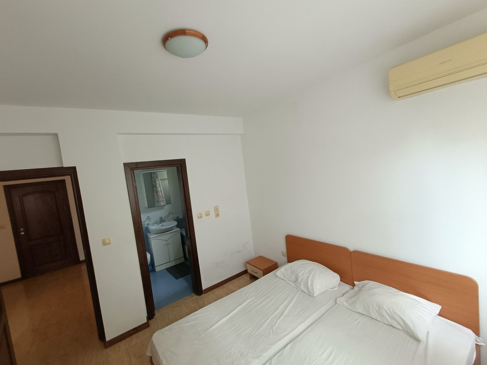 2 bedrooms with double beds, wardrobes, bedside tables, and lamps — one with air conditioning and an en-suite bathroom featuring a bathtub, sink, and WC