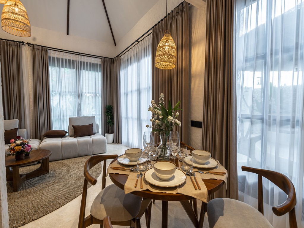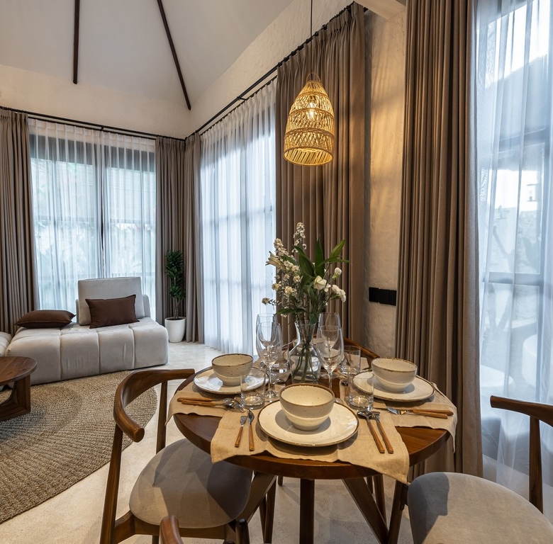 Inside, the villa showcases 110.2 sqm of bright and functional living space, thoughtfully arranged across a 2+1 layout. Contemporary interiors, high ceilings, and seamless indoor–outdoor flow make the home ideal for both personal living and rental appeal. Large windows and sliding doors invite natural light throughout the villa, while the private swimming pool and landscaped outdoor area create an intimate retreat surrounded by nature.