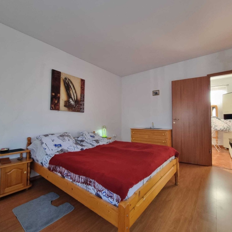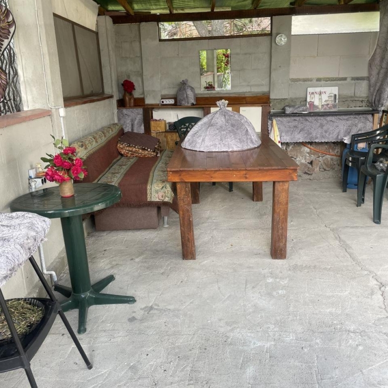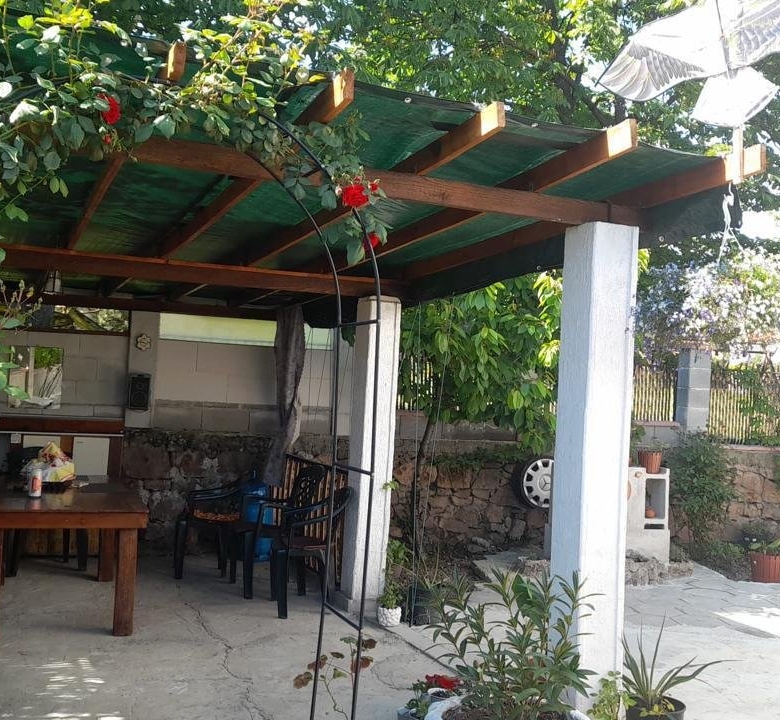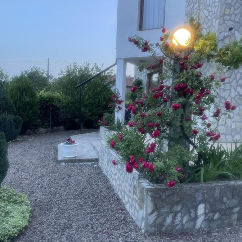 The house is located on a flat, well-maintained plot (400 m²) with a barbecue area, parking space, blooming shrubs, and grapes. Electricity and water are centralized, and there is a septic tank. Video surveillance is installed.