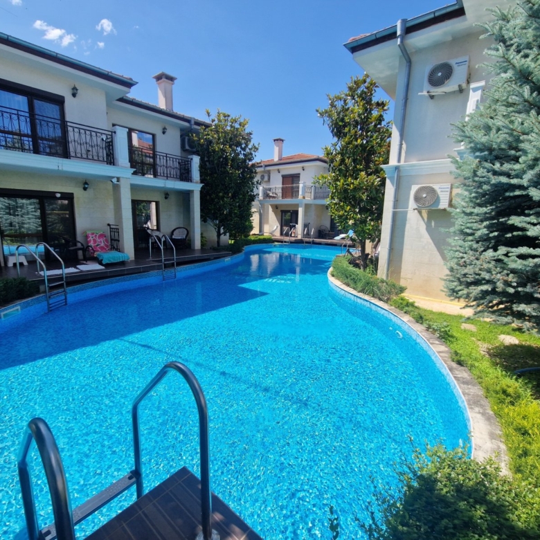 We are pleased to present you with an attractive single-family house with direct access to the pool in the popular seaside resort of Ravda, Bulgaria. The property offers a living area of 116 m² and spans two floors. It is ideally suited both as a holiday home and for permanent residence.